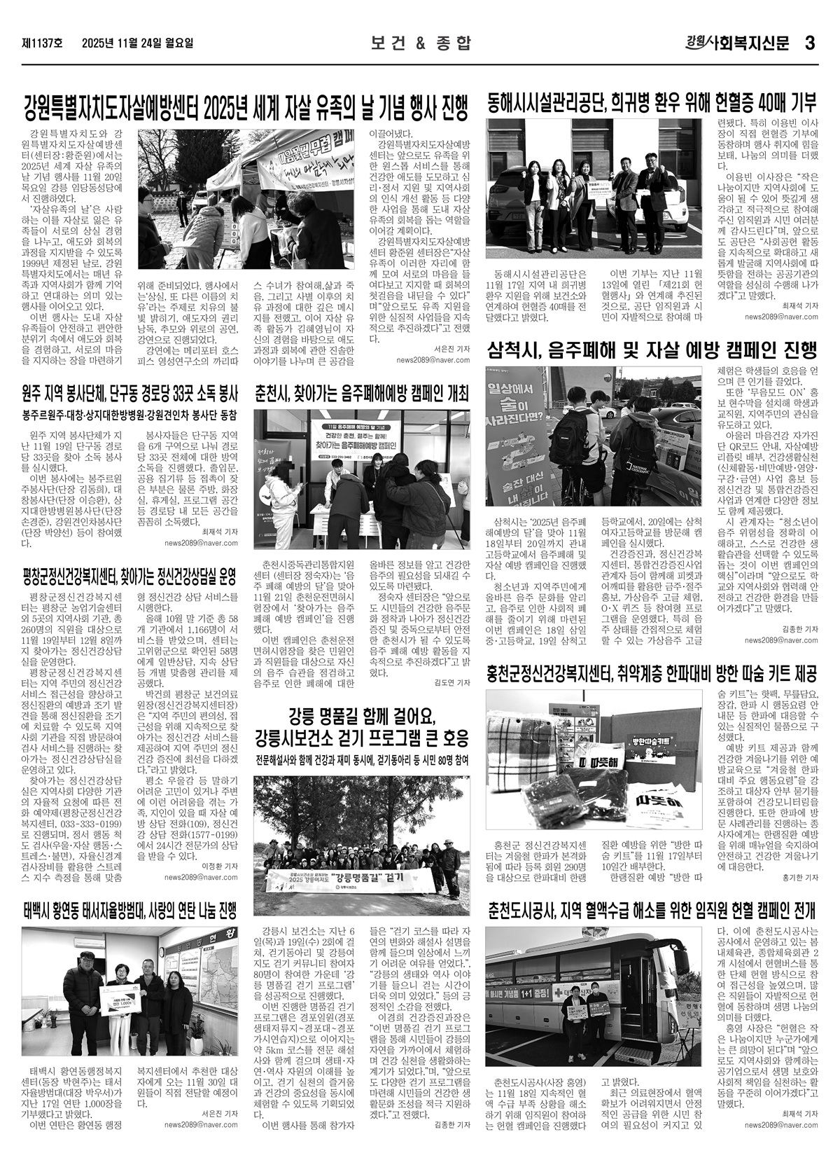 철원군 정신건강복지센터는 주민의 정신건강을 위해 철원·동송읍 지역의 기초수급자 등을 대상으로 마음검진사업을 실시한다고 밝혔다. 취약계층을 대상으로 하는 정신건강증진·자살예방사업을 실시하여 정신건강 및 자살 고위험군을 조기에 발견하고, 위기 상황 발생 전 적기에 개입하여 정서적·심리적 안정을 제공하기 ...