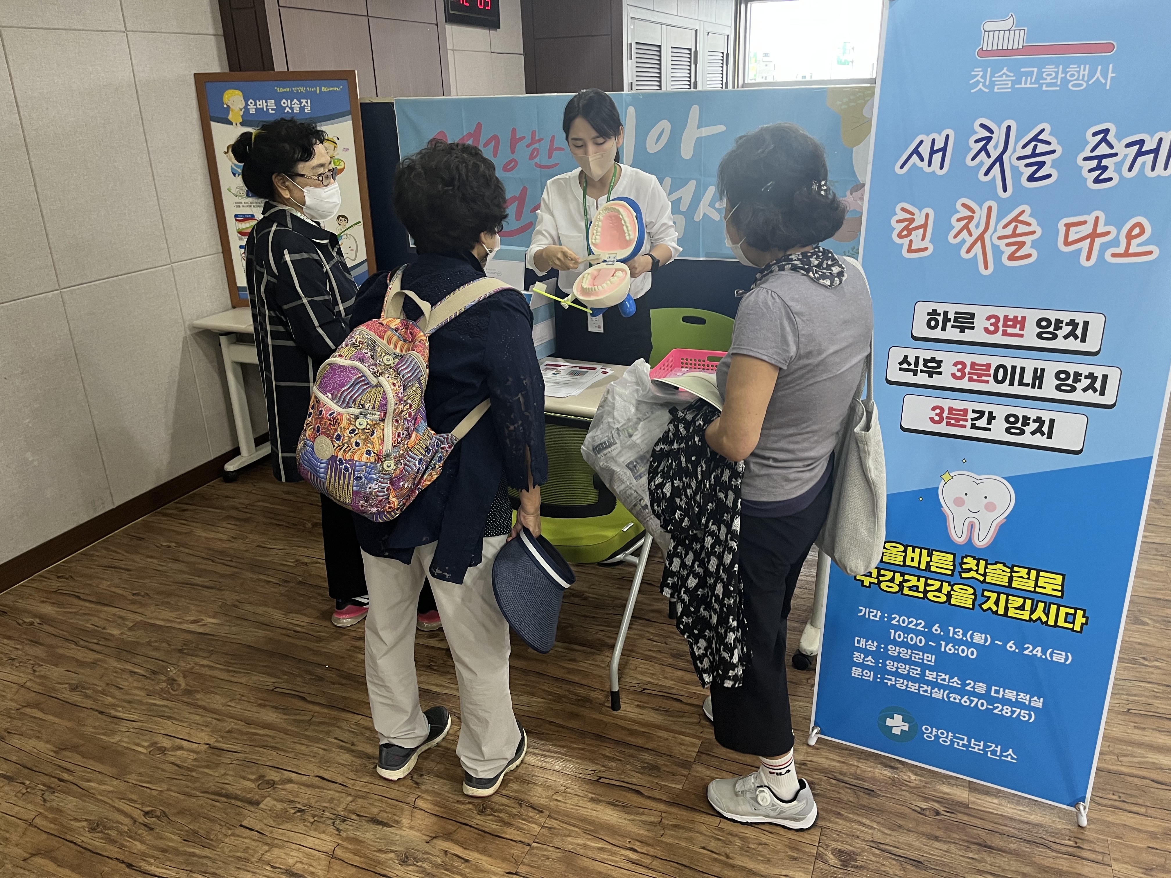 6월 23일부터 7월 4일까지, 보건소에서 군민 대상 칫솔 교환 양양군보건소는 제80회 구강보건의 날을 기념해 주민들의 구강질환 예방과 올바른 칫솔질 실천을 유도하기 위한 ‘새 칫솔 줄게 헌 칫솔 다오’ 칫솔 교환 행사를 6월 23일(월)부터 7월 4일(금)까지 실시한다. 이번 행사는 군민들에게 구강보건 교육과 예방 서비스...