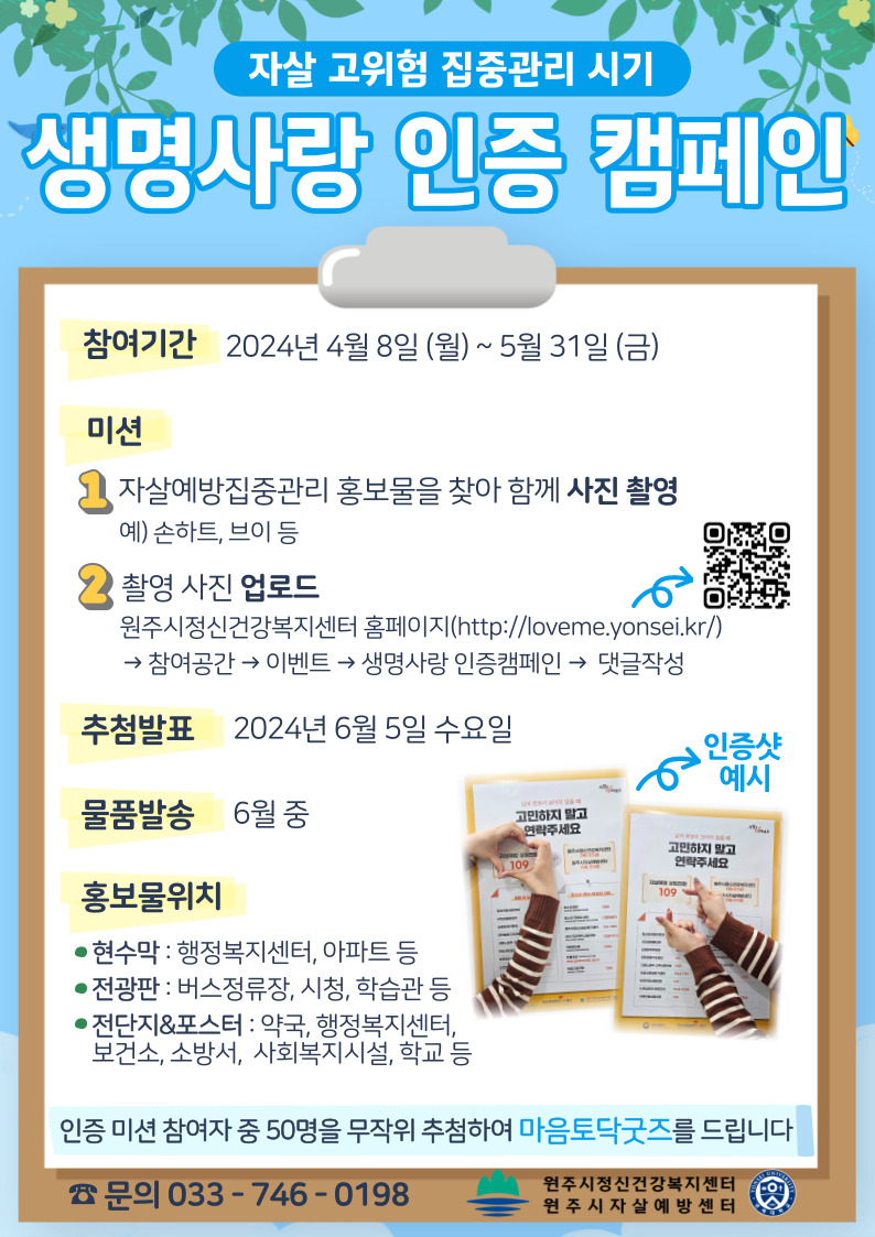 5월 31일까지 이벤트 참여 사진 업로드, 추첨자 50명 굿즈 제공 원주시정신건강복지센터 부설 자살예방센터는 자살 고위험시기인 봄철(3월~5월) 집중 관리를 위해 비대면 인증 캠페인을 진행한다. 참여 방법은 아파트, 병·의원, 약국, 금융기관, 사회복지시설 등 1,300여 곳에 게시된 ‘위기대응 사회서비스 안내문 또는 현...
