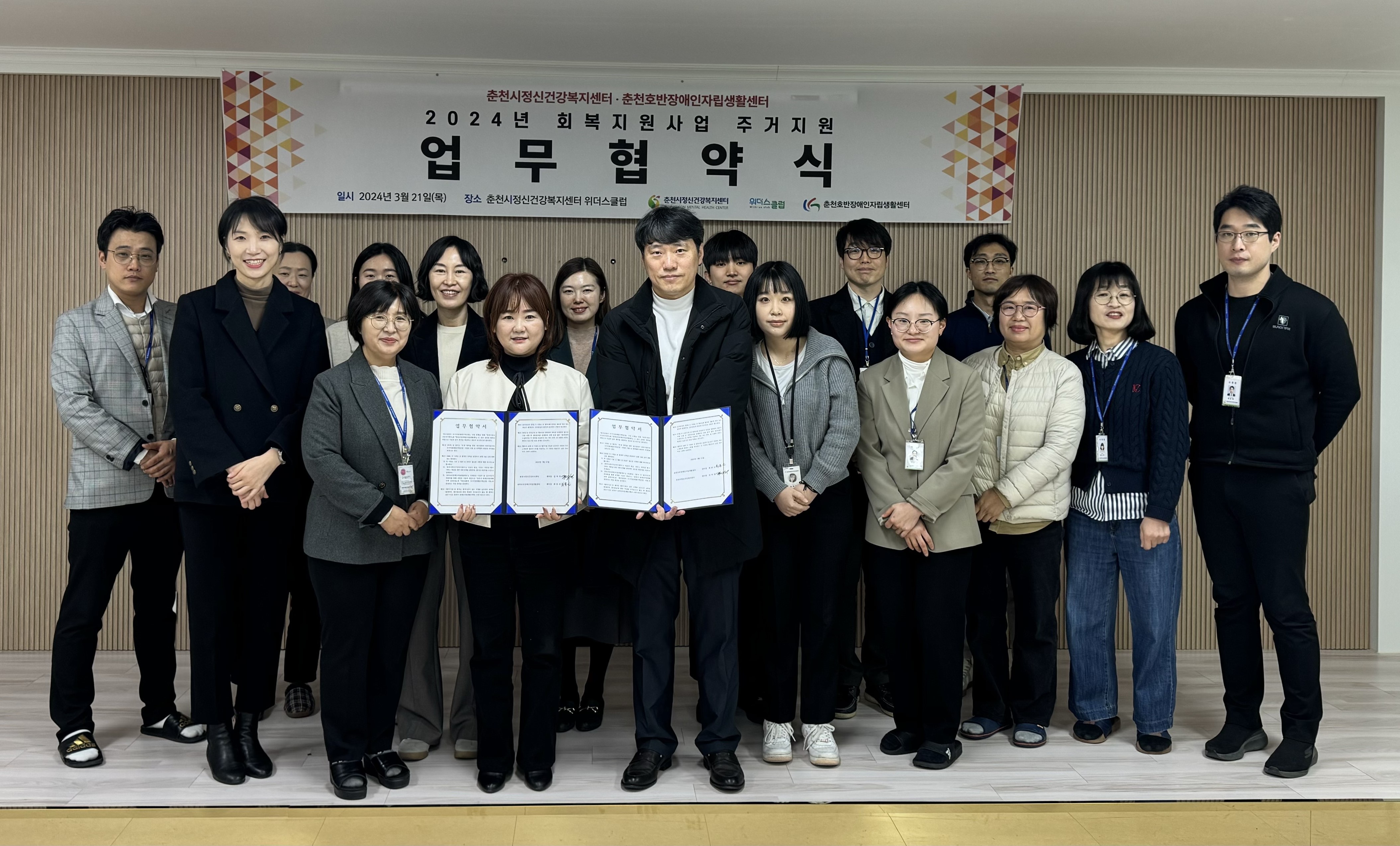춘천시정신건강복지센터(센터장 김미정)와 춘천호반장애인자립생활센터(센터장 최종신)는 지난 3월 21일 위더스클럽에서 주거지원이 필요한 정신장애인을 대상으로 자립 생활을 지원하는 체험 주택 서비스 업무 협약을 맺었다.