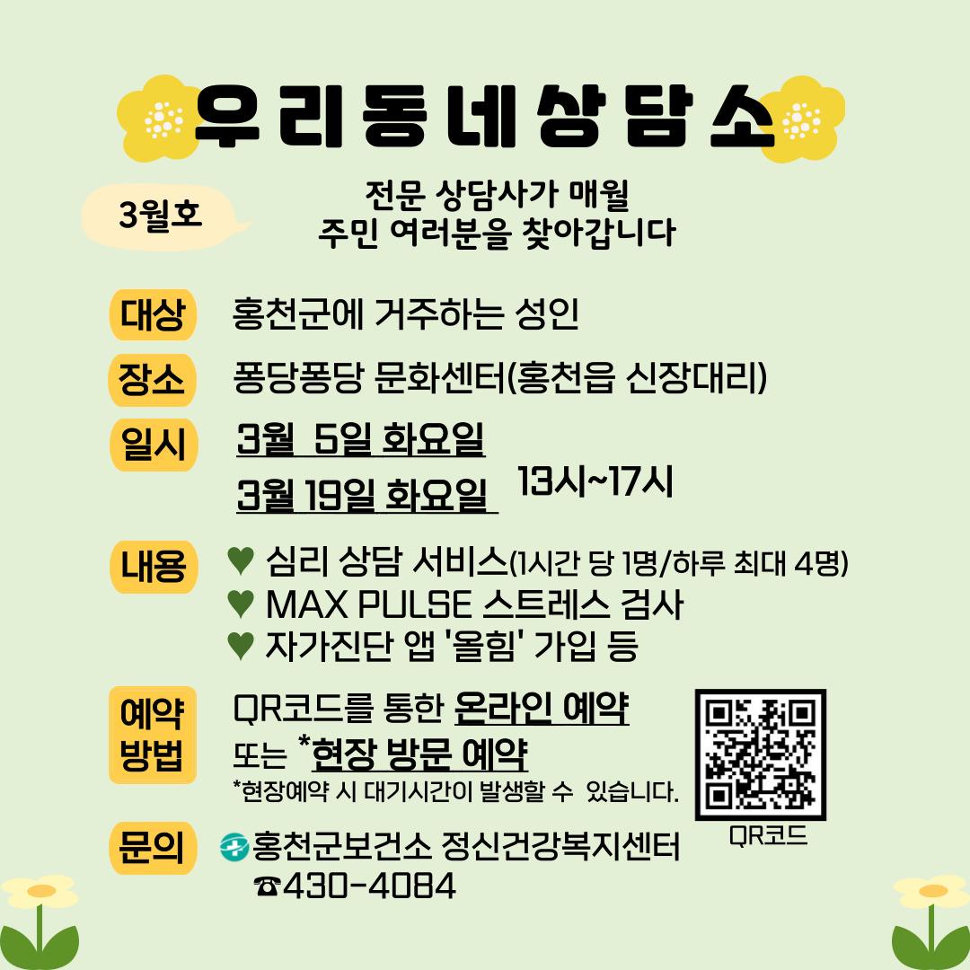 홍천군 보건소 정신건강복지센터가 우울감 및 심리적 어려움을 겪는 주민을 위해 '찾아가는 심리지원 서비스'를 운영한다. 본 사업은 2024년 주민참여예산사업에 선정되어 추진하는 것으로, 홍천읍에 성인을 위한 상담소를 마련해달라는 의견을 수렴하여 지난 2월 27일부터 신장대리에 위치한 퐁당퐁당 문화센터에서 '우리동...