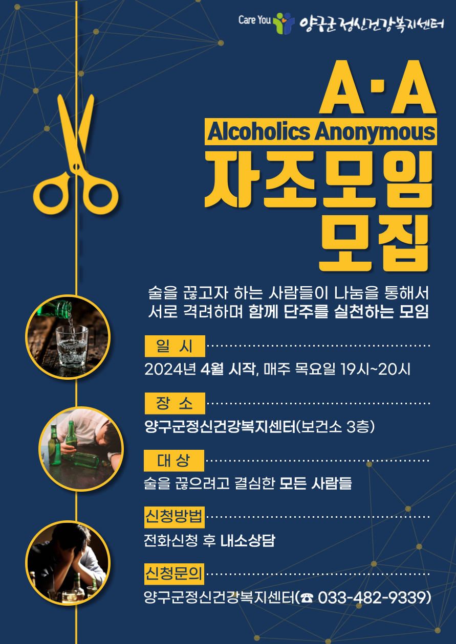 양구군정신건강복지센터(센터장 이상규)가 4월부터 A.A(Alcoholics Anonymous, 익명의 알코올중독자들) 단주(斷酒) 자조 모임을 실시한다. A.A 자조 모임은 스스로 술을 끊으려고 결심한 사람들이 자체적인 모임을 통해 알코올 중독에서 회복으로 가는 삶을 서로 격려하고 생활 나눔을 통해 함께 극복하기 위한 모임이다. 자...