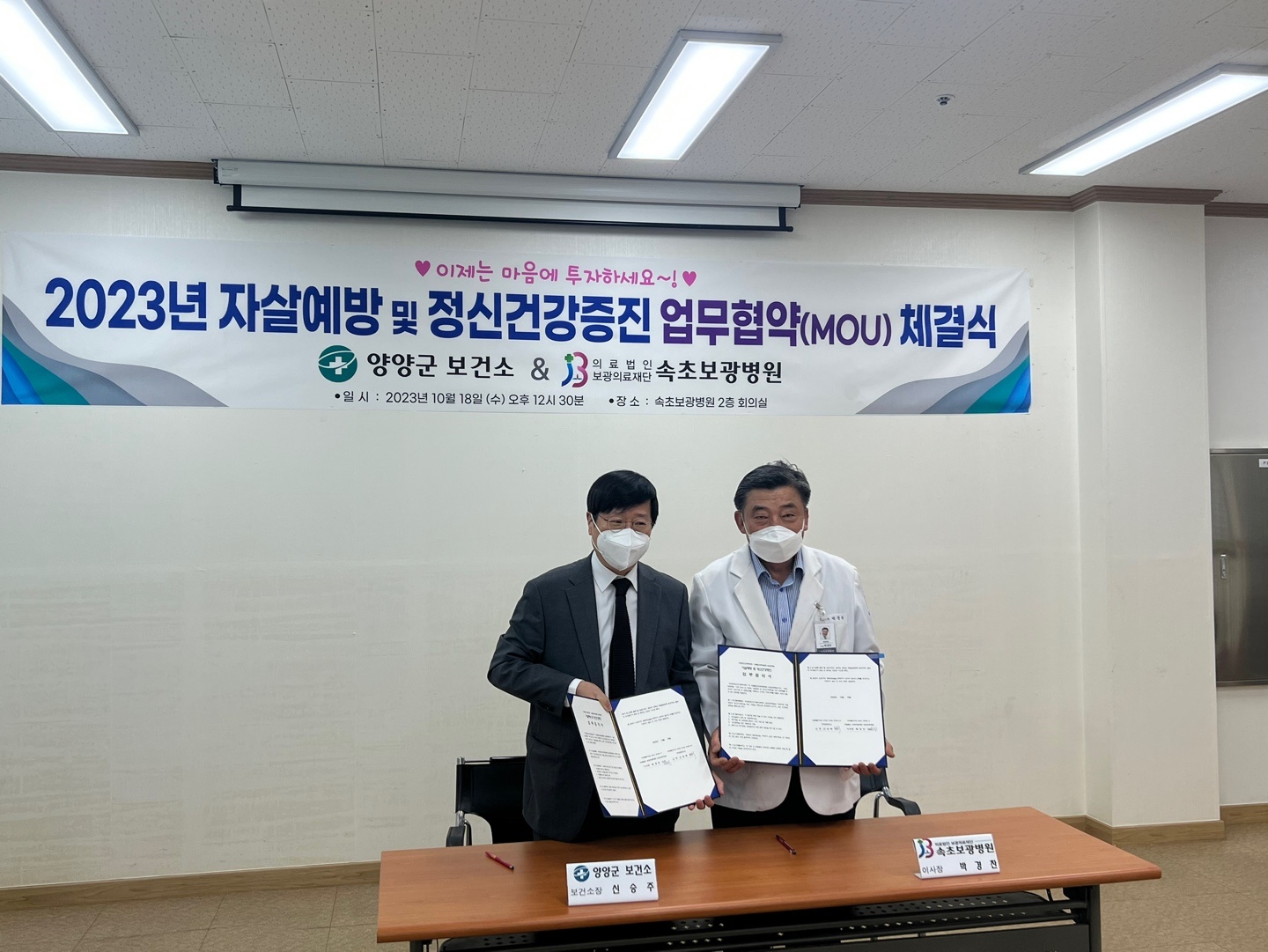 양양군 보건소 정신건강복지센터(센터장 신승주 보건소장)는 지난 10월 18일 속초 보광병원에서, 의료법인 보광의료재단 속초보광병원(이사장 박경찬)과 지역 정신건강 사업 활성화를 위한 업무협약을 체결하였다. 이는 지역의 자살예방 및 정신건강증진을 위한 공동체를 형성하여 유관기관 간 네트워크를 구축하고 건강한 지...