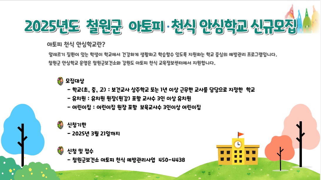 “아토피·천식 안심학교 등록 아이의 건강 챙겨주세요” 철원군보건소는 2025년 아토피·천식 예방관리사업 운영을 위해, 관내 유치원, 어린이집 및 초·중·고등학교 대상 ‘아토피·천식 안심학교’ 참여 기관을 모집할 예정이다. ‘아토피·천식 안심학교’는 학생들이 안전한 환경에서 생활할 수 있도록 알레르기 질환(...