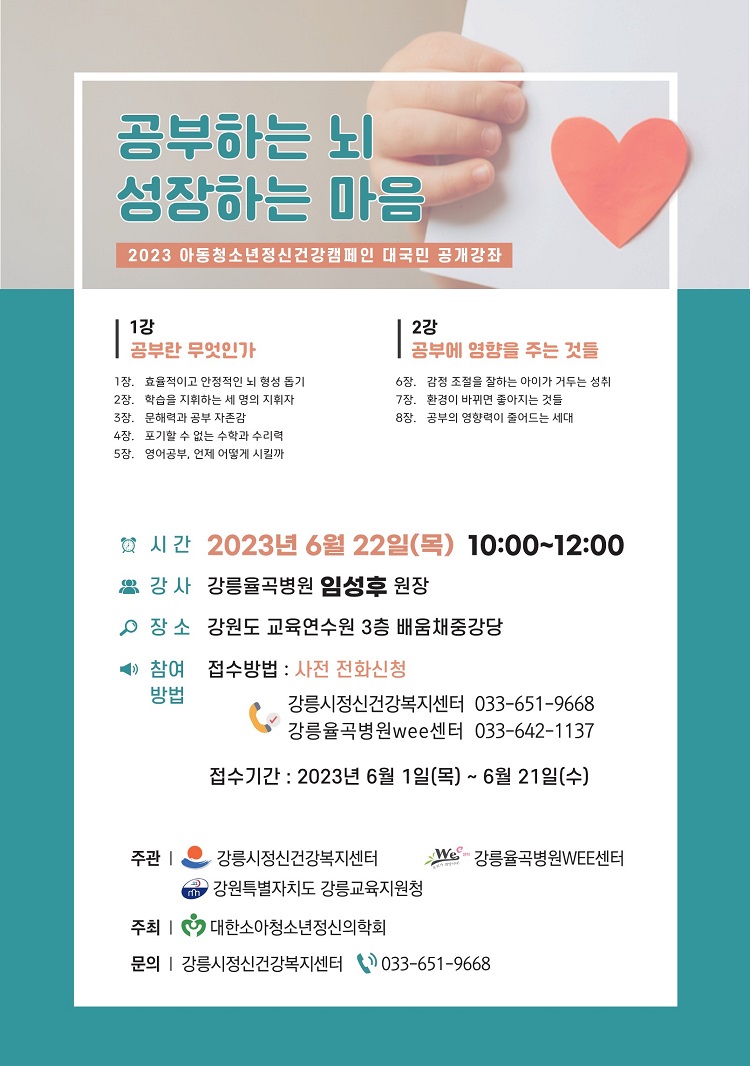 [강원사회복지신문 홍기한 기자]=오는 6월 22일(목), 아동·청소년 정신건강 증진을 위한 강좌 진행 강릉시정신건강복지센터는 아동·청소년의 정신건강 증진을 위해 오는 6월 22일(목) 오전 10시 강원도 교육연수원 3층에서 '2023 아동청소년 정신건강캠페인' 공개강좌를 개최한다. 강릉율곡병원WEE센터, 강릉교육지원청과 ...