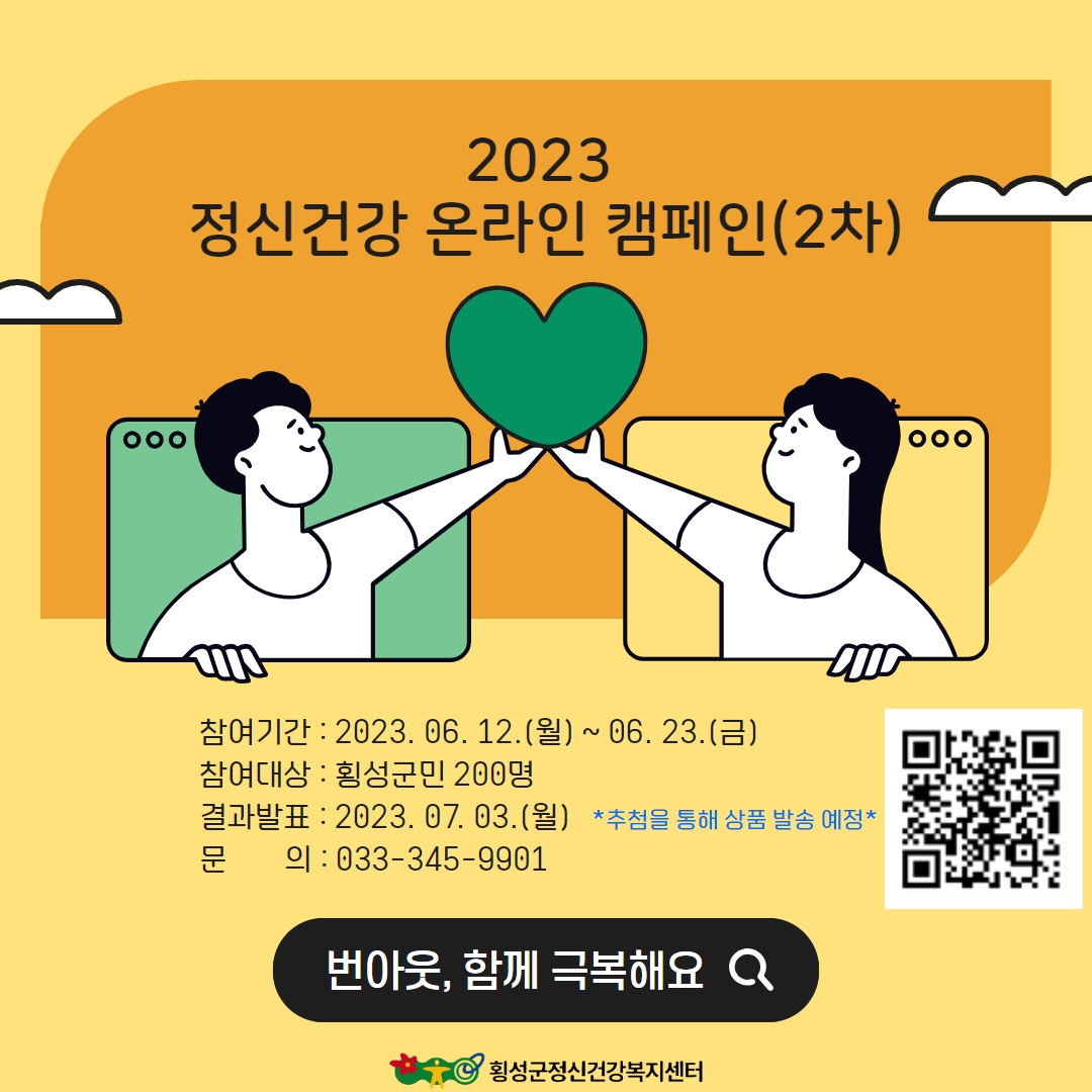 [강원사회복지신문 서은진 기자]=횡성군정신건강복지센터에서는 횡성군민 대상으로 6월 12일부터 6월 23일까지 '번아웃, 함께 극복해요!'를 주제로 정신건강 온라인 캠페인(2차)을 진행한다고 밝혔다. 이번 정신건강 캠페인은 번아웃(Burn-out)에 대한 정신건강 정보 안내와 번아웃으로 힘들어하는 횡성군민의 스트레스 감소...