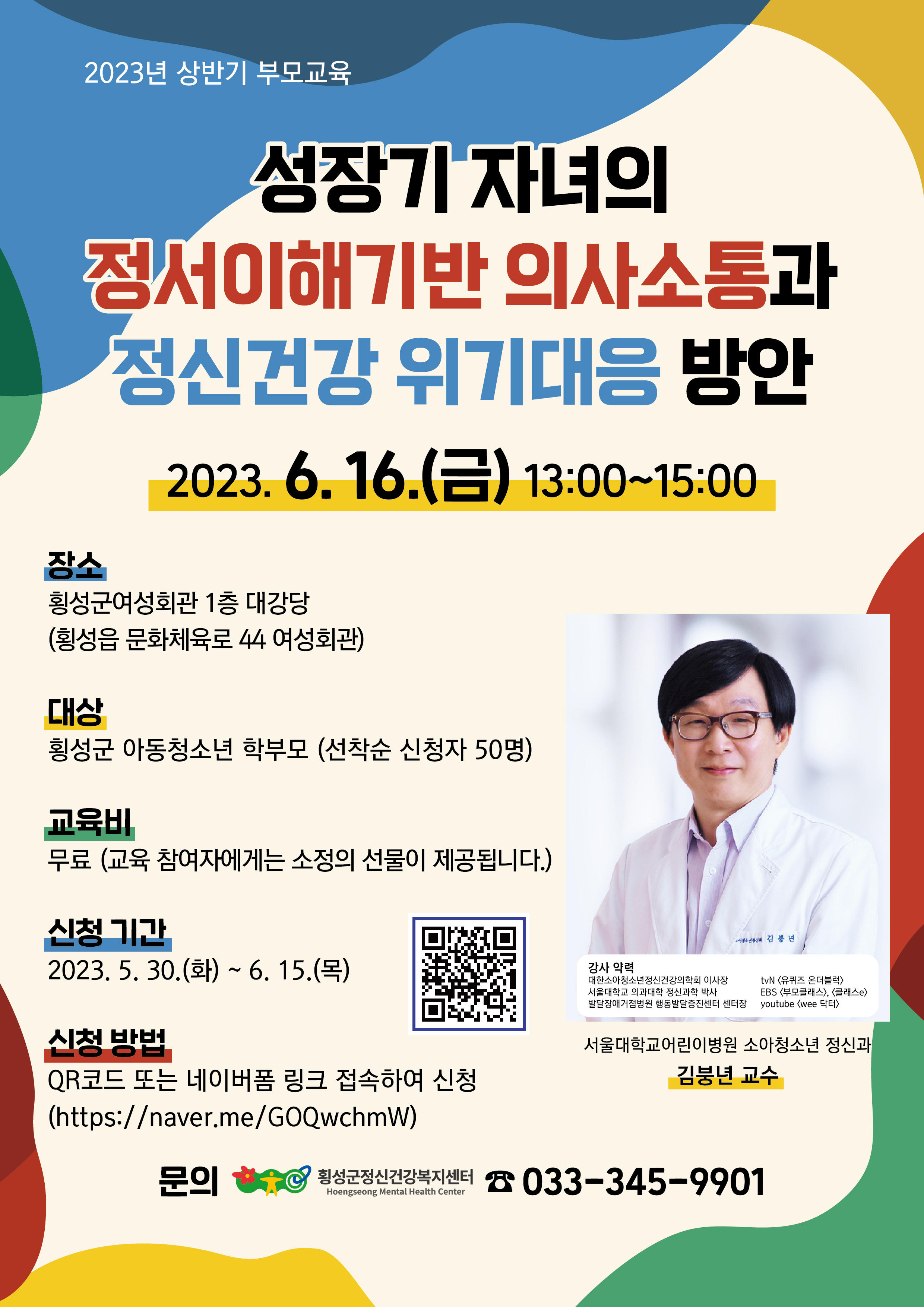 [강원사회복지신문 이정환 기자]=횡성군 정신건강복지센터에서는 아동·청소년 정신건강 증진사업의 일환으로 오는 6월 16일(금) 횡성군여성회관 대강당에서 아동·청소년 학부모를 대상으로 상반기 부모교육을 진행한다고 밝혔다. 이번 부모교육은 성장 과정에서 심리 정서적 어려움을 경험하는 자녀들을 이해하고, 학부모의...
