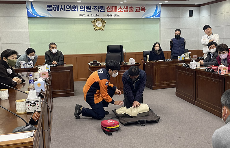 [강원사회복지신문 김종한 기자]=동해시의회(의장 이동호)는 지난 12월 21일, 의회 2층 소회의실에서 의회 의원과 직원 전원을 상대로 심폐소생술 및 자동심장충격기 사용법 등에 대한 교육을 실시했다. 이번 교육은 이태원 참사와 같이 비상상황 발생시 즉각 대처할 수 있는 응급처치 능력의 함양을 위해 실시했다. 동해시의...