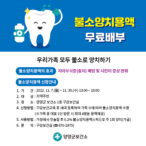 [강원사회복지신문 김종한 기자]=양양군이 지역주민의 건강한 치아 관리를 위해 11월 7일부터 이달 말까지 불소양치용액을 무료로 소진시까지 배부한다고 밝혔다. 불소양치용액 사용은 시간과 노력 대비 효율적인 양치 방법으로 구강질환의 원인이 되는 음식물 속의 당과 세균 형성을 억제하고, 치아 부식의 원인인 산으로부...