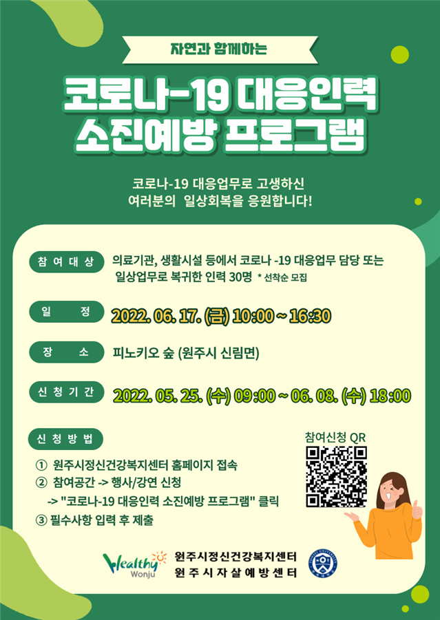 [강원사회복지신문 서은진 기자]=의료기관, 입소시설 종사자 대상, 6월 17일 피노키오 자연휴양림에서 진행 원주시정신건강복지센터는 의료기관과 입소시설 등에서 코로나19 대응 업무를 담당하거나 일상업무로 복귀한 인력을 대상으로 '코로나-19 대응인력 소진예방 프로그램'을 운영한다. 프로그램은 오는 6월 17일 피노키...
