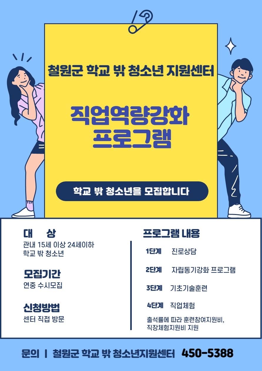 [강원사회복지신문 홍기한 기자]=철원군 학교 밖 청소년 지원센터(센터장 신민호)는 2023년 직업역량강화프로그램 운영을 위해 직업체험 활동에 관심이 있는 학교 밖 청소년을 모집하고 있다. 참여대상자는 학교를 자퇴하거나 상급학교를 미진학하여 홈스쿨링을 하고 있는 청소년이 대상이 되며 수시모집 공고를 통해 관내 사...