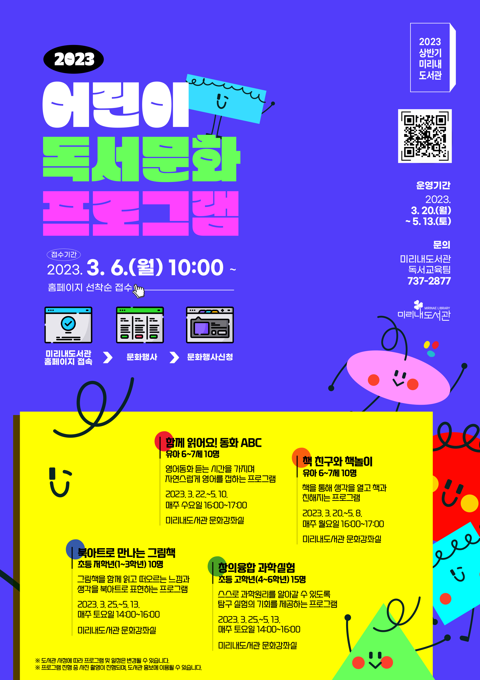 [강원사회복지신문 이정환 기자]=함께 읽어요! 동화 ABC, 책 친구와 책 놀이, 북 아트로 만나는 그림책, 창의융합 과학실험 등 총 4개 강좌 운영 오는 3월 6일 오전 10시부터 미리내도서관 홈페이지 선착순 접수 미리내도서관(관장 이선화)은 오는 3월부터 유아와 어린이를 대상으로 상반기 어린이 독서문화 프로그램을 운영...