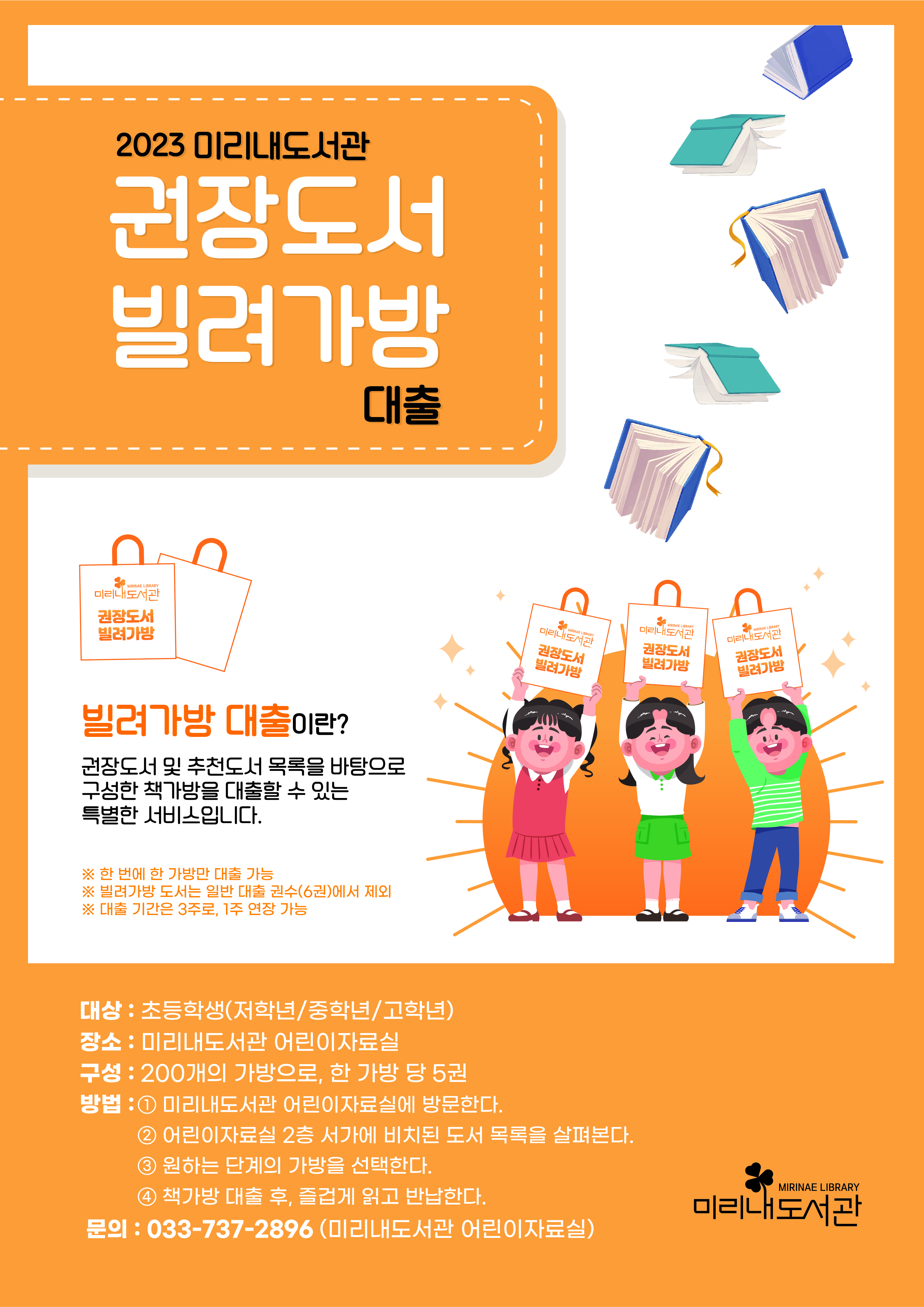 [강원사회복지신문 서은진 기자]=대출 기간 3주, 일반 대출 권수인 6권에서 제외 미리내도서관 어린이자료실에서 원하는 학년과 꾸러미 선택 후 대출 미리내도서관(관장 이선화)은 오는 3월 2일부터 관내 초등학생을 대상으로 2023년 '권장도서 빌려가방' 대출 서비스를 운영한다. '권장도서 빌려가방'은 초등학교와 한국학교...