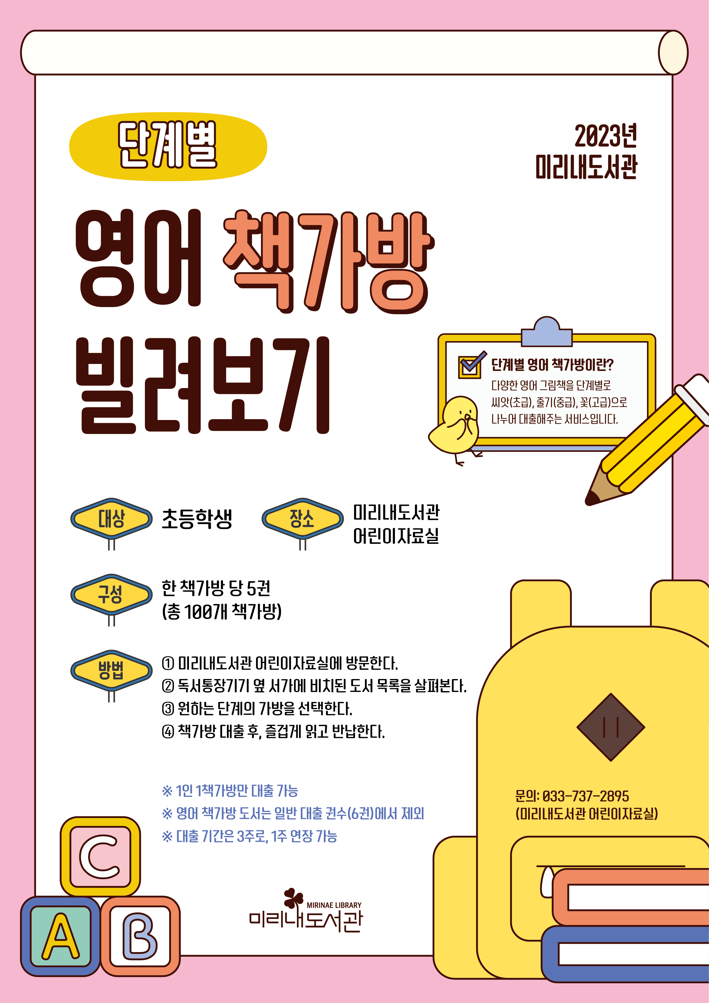[강원사회복지신문 김도연 기자]=미리내도서관(관장 이선화)은 오는 3월 2일부터 관내 초등학생을 대상으로 '단계별 영어 책가방 빌려보기'를 운영한다. 단계별 영어 책가방 빌려보기는 도서관에서 추천하는 다양한 영어그림책을 수준별로 나누어 대출해주는 서비스이다. 씨앗(초급), 줄기(중급), 꽃(고급) 등 총 3단계로 나...