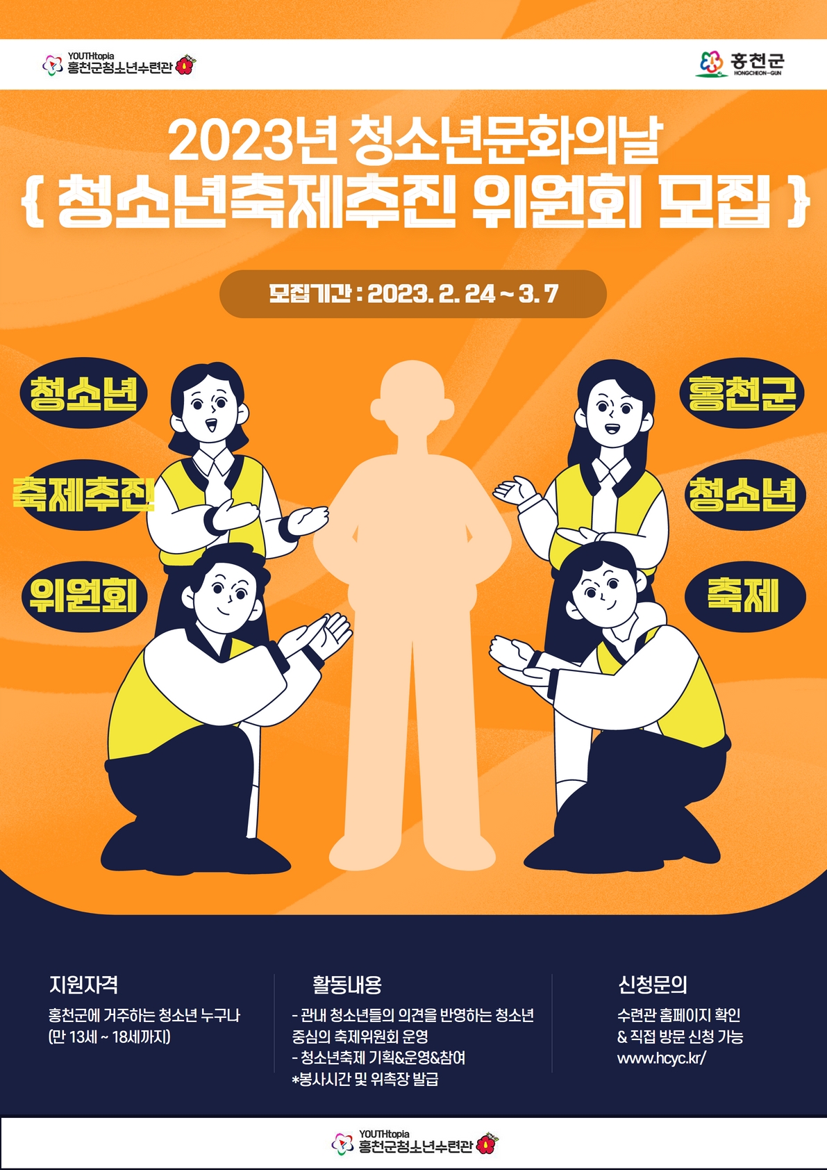 [강원사회복지신문 홍기한 기자]=홍천군청소년수련관은 청소년들이 기획·운영·평가·보완할 수 있는 활동을 제공하여 청소년들의 재능과 끼를 발산할 수 있는 주체적인 청소년 활동의 장을 마련 하고자 2023년 청소년 문화의 날 '청소년축제 추진위원회'를 3월 7일까지 모집한다고 밝혔다. 청소년 문화의 날 행사는 2021년...