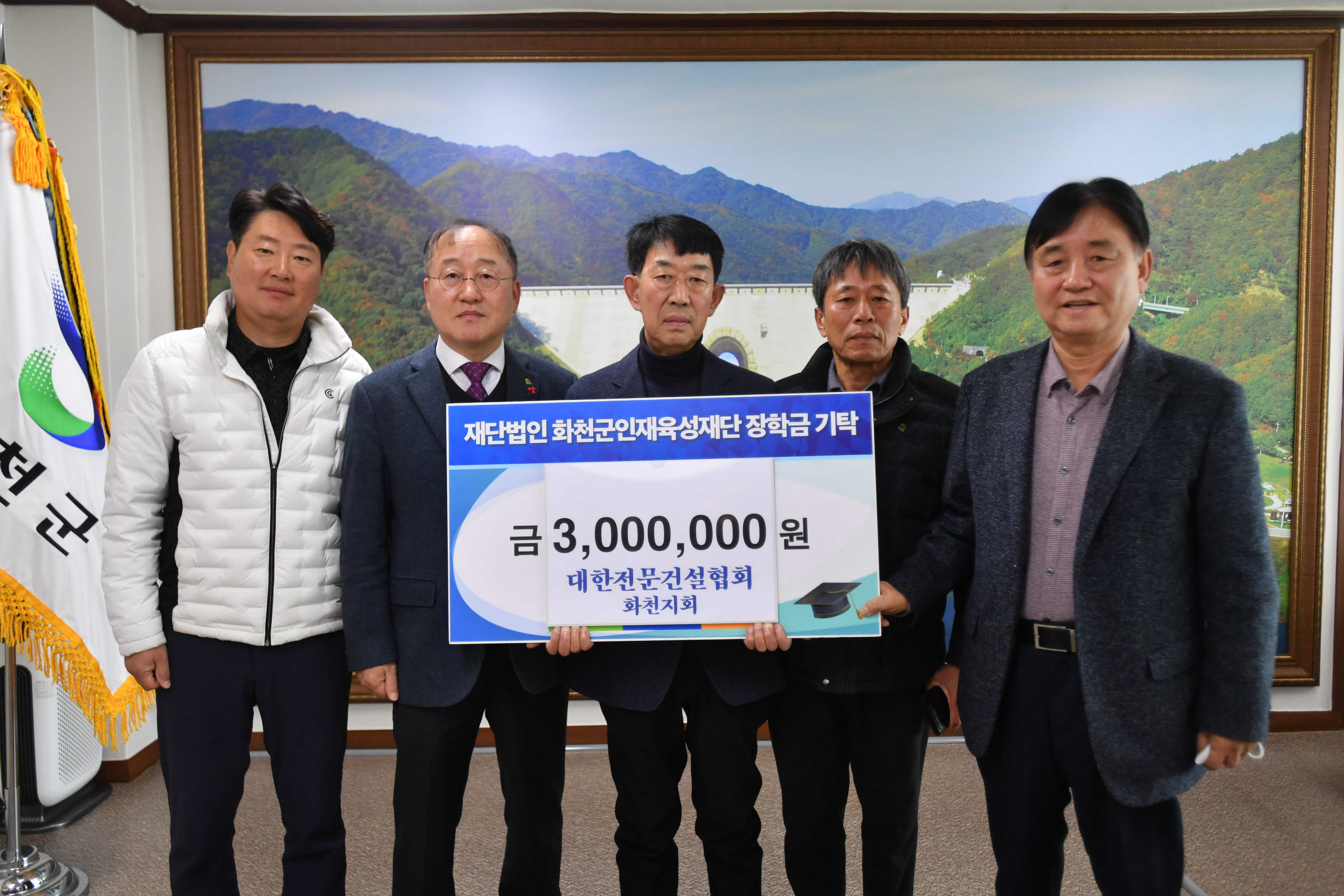 [강원사회복지신문 이정환 기자]=대한전문건설협회 화천군지회(회장:김진일)는 지난 2월 14일 최문순 화천군 인재육성재단 이사장을 방문해 장학금 300만원을 기탁했다.