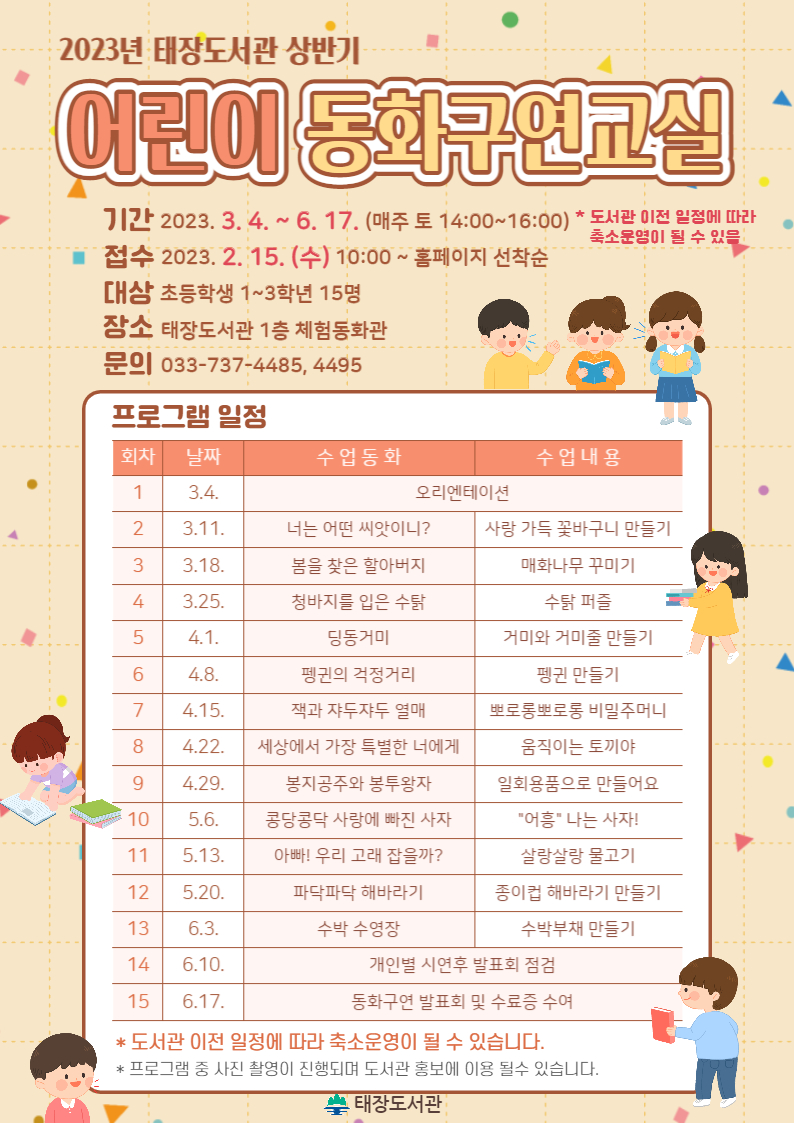 [강원사회복지신문 김도연 기자]=2월 15일 오전 10시부터 태장도서관 홈페이지 선착순 접수 태장도서관은 오는 3월부터 초등학교 1~3학년을 대상으로 '2023년 상반기 어린이 동화구연교실'을 운영한다. 어린이 동화구연교실은 책을 읽고 내용에 따라 목소리 연기와 몸짓 표현을 해보는 실습수업이다. 3월 4일부터 6월 17일까...