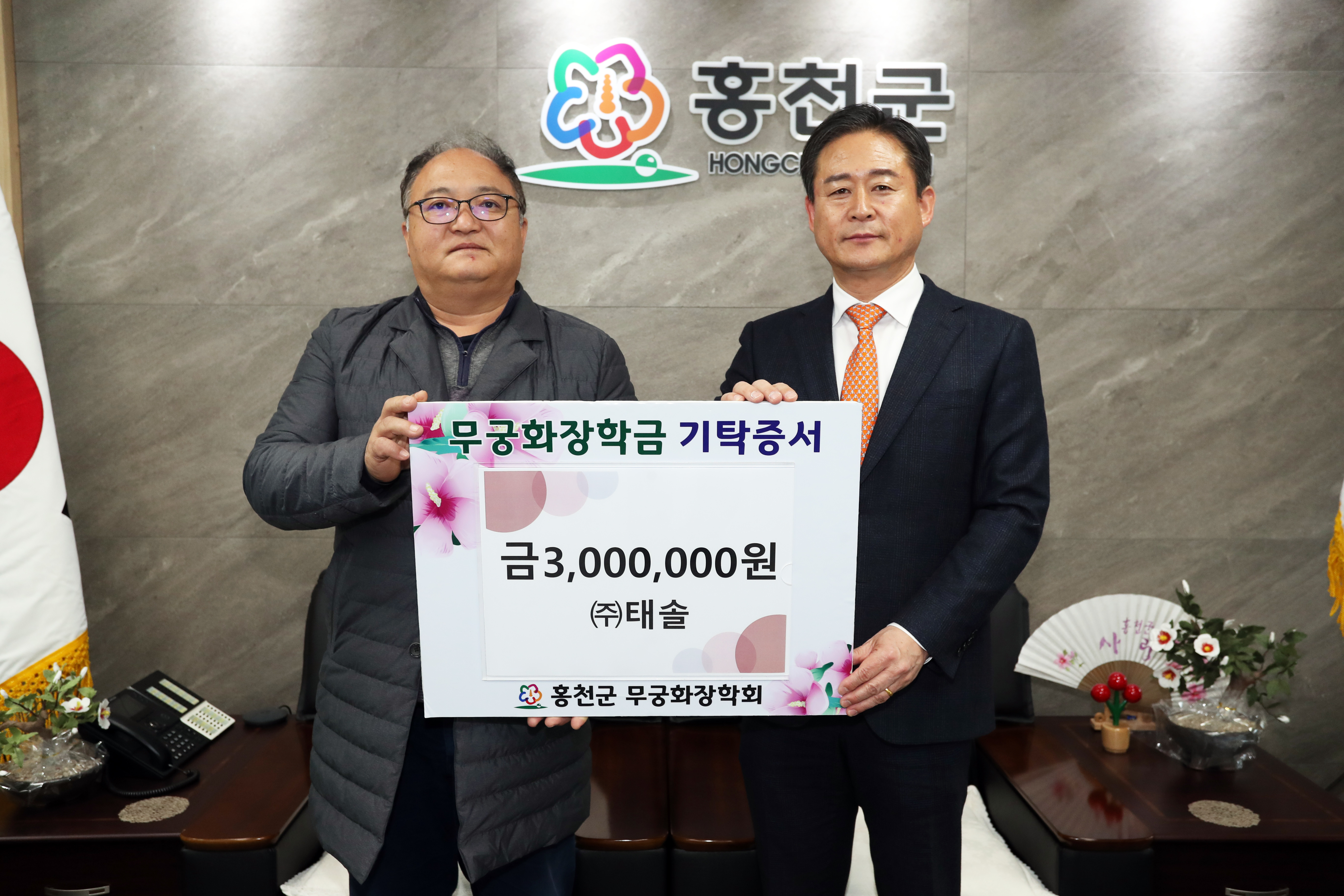 [강원사회복지신문 홍기한 기자]=(주)태솔(대표 지연홍)은 지난 2월 16일 홍천군청을 방문해 인재육성을 위한 무궁화장학금 300만원을 기탁했다.