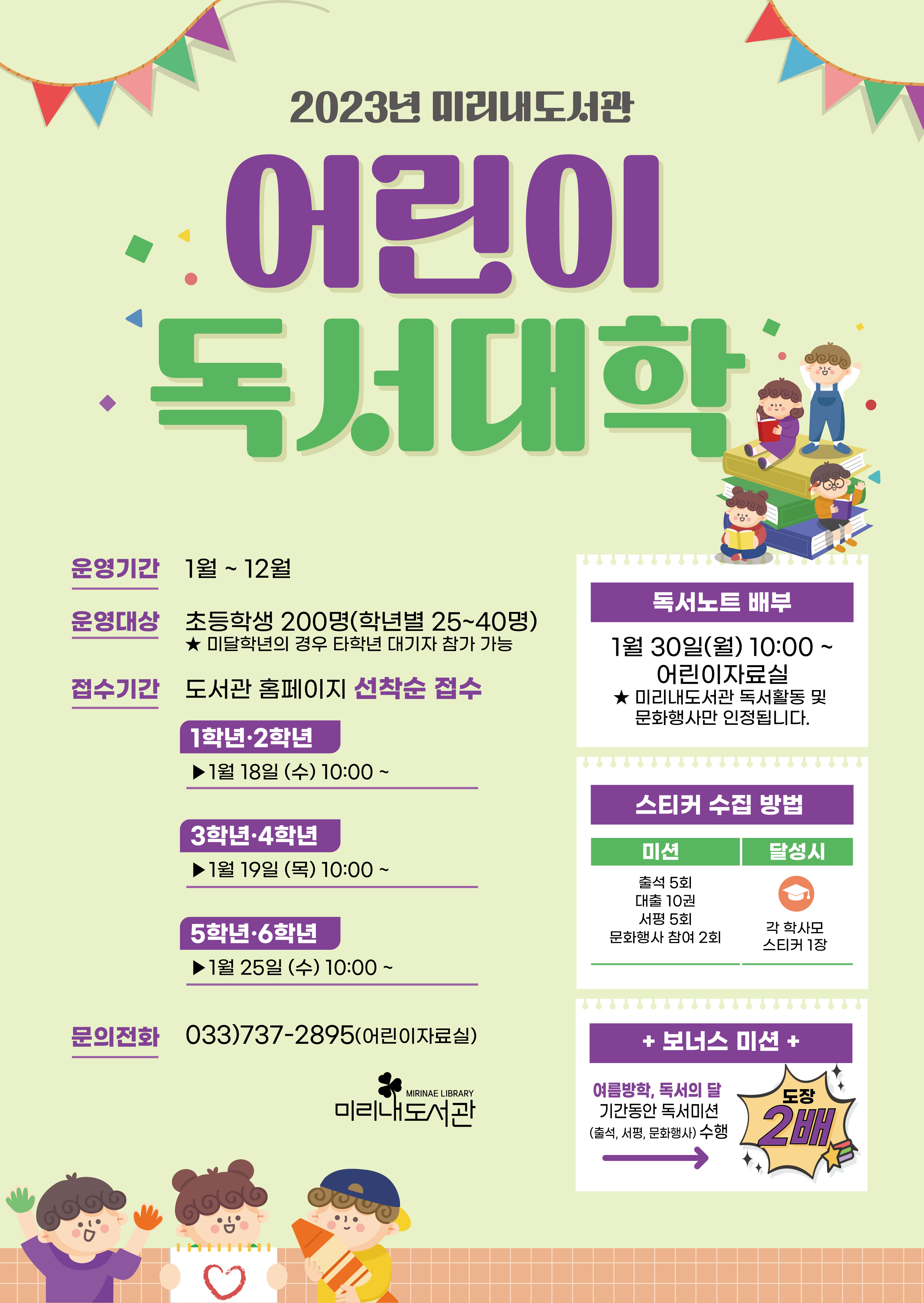 [강원사회복지신문 서은진 기자]=오는 1월 18일부터 미리내도서관 홈페이지에서 초등학생 200명 선착순 모집 원주 미리내도서관(관장 이선화)은 오는 1월 18일부터 생애주기별 독서 프로그램인 '어린이 독서대학'에 참가할 어린이를 모집한다. 어린이 독서대학은 어린이의 눈높이에 맞는 독서 활동을 통해 독서의 즐거움을 일...