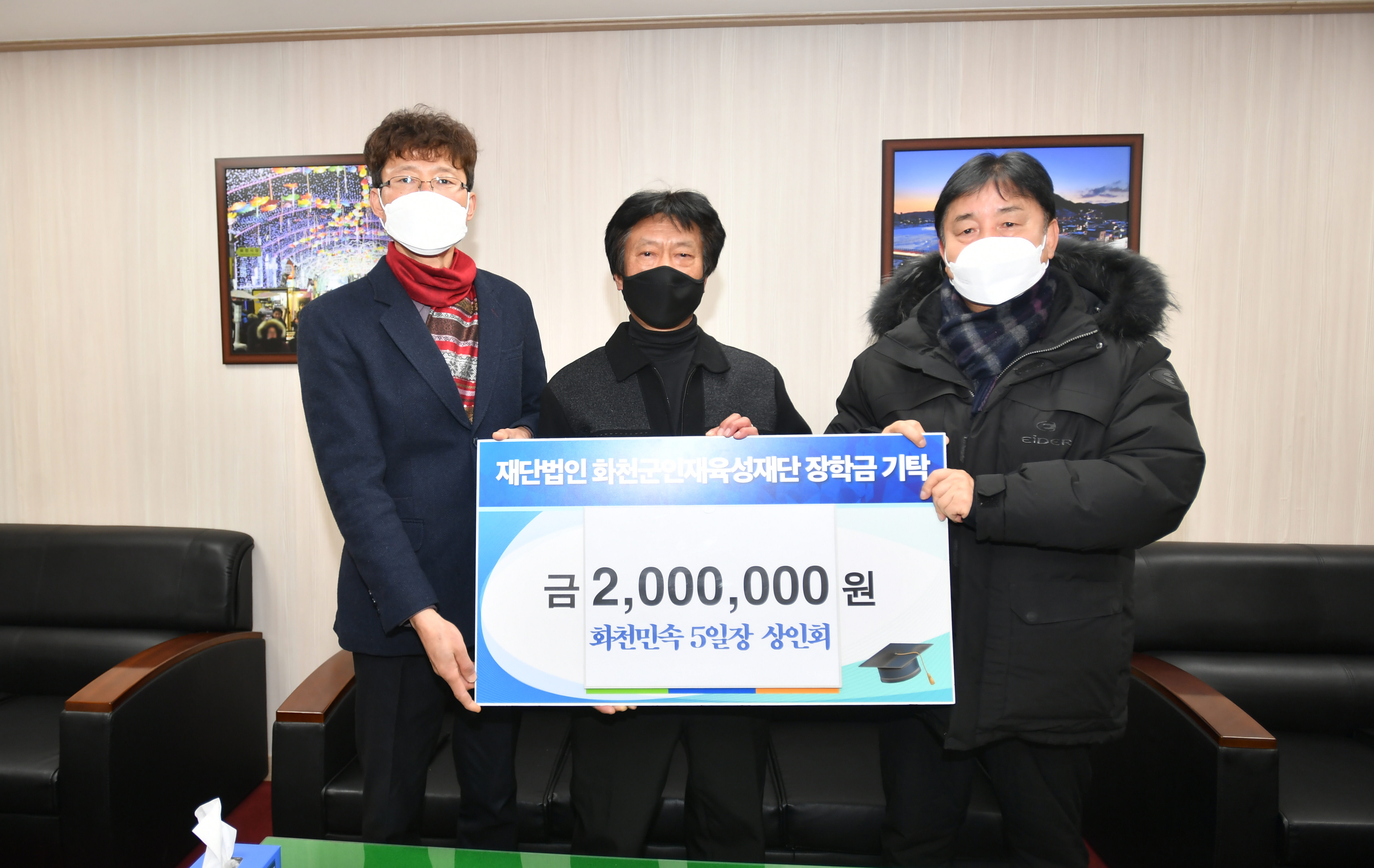 [강원사회복지신문 김도연 기자]=화천민속5일장 상인회는 지난 1월 12일 산천어축제장을 방문해 최문순 (재)화천군 인재육성재단 이사장에게 장학금 200만원을 기탁했다.