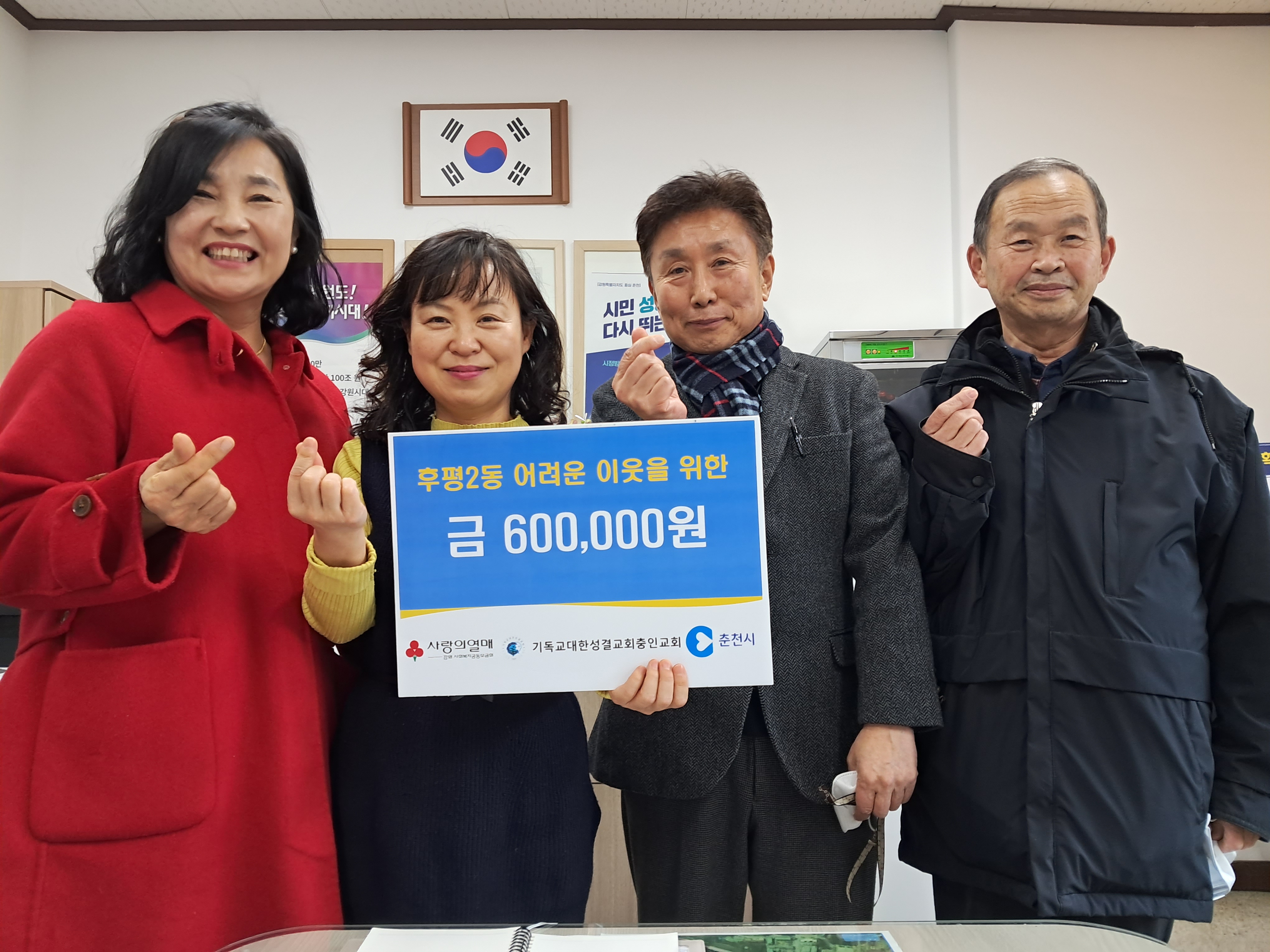 [강원사회복지신문 홍기한 기자]=기독교 대한성결교회 충인교회(담임목사 이종규)는 지난 1월 11일 춘천시 후평2동 행정복지센터(동장 이명숙)를 방문해 관내 어려운 이웃을 위한 장학금 60만원을 전달했다.