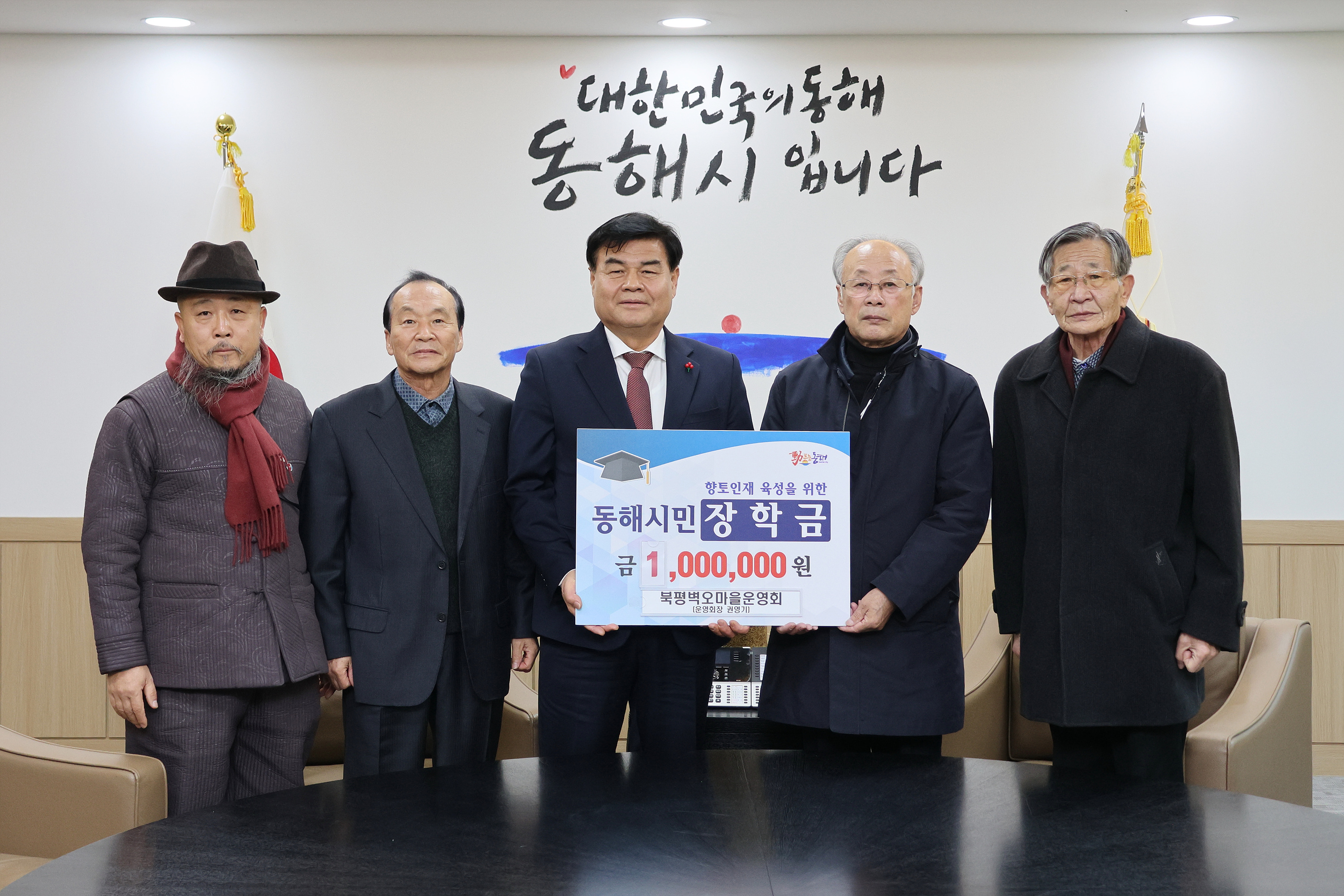 [강원사회복지신문 김종한 기자]=동해시 북평벽오마을운영위원회(운영회장 권영기)는 지난 1월 5일 동해시청을 방문, 향토인재 육성을 위한 동해시민 장학금 1백만원을 심규언 시장에게 기탁했다.