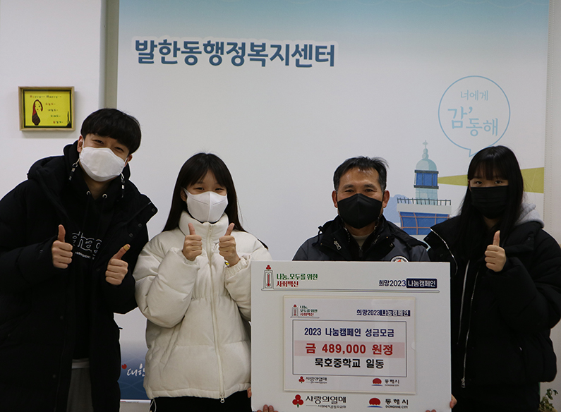 [강원사회복지신문 김도연 기자]=동해 묵호중학교 학생 일동(학생회장 손서현, 학생부회장 장수인)은 지난 최근 개최된 묵호중학교 축제인 해동제 수익금 일부 489,000원을 발한동에 성금으로 기탁했다. 손서현 묵호중학교 학생회장은 "학생들을 대표해 나눔캠페인 성금을 기탁할 수 있어서 영광이며 나눔캠페인 성금 기탁으...