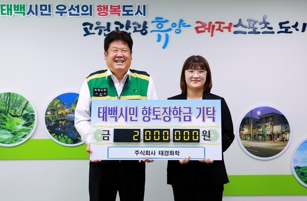 (주)태경화학(대표 임환희)는 지난 8월 20일 태백시에 미래인재 육성을 위한 장학금 200만 원을 기탁하였다. 임대표는 “기탁한 장학금이 작지만 큰도움이 되길 바라고 학생들의 꿈을 응원한다. 앞으로도 꾸준히 나눔의 온기를 전하는 기업이 되도록 힘쓰겠다“고 기탁의 뜻을 밝혔다.