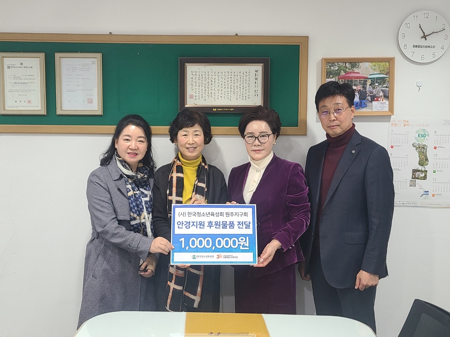 [강원사회복지신문 서은진 기자]=(사)한국청소년육성회 원주지구회(회장 신예섬)는 지난 11월 14일 월요일 명륜종합사회복지관(관장 박현숙)에 100만원 상당의 안경지원 상품권을 전달하였다. 안경지원 상품권은 시력저하 등 안경교체가 필요하나 경제적 어려움으로 안경을 제때 교체하지 못하거나 구입하지 못하고 있는 저소...
