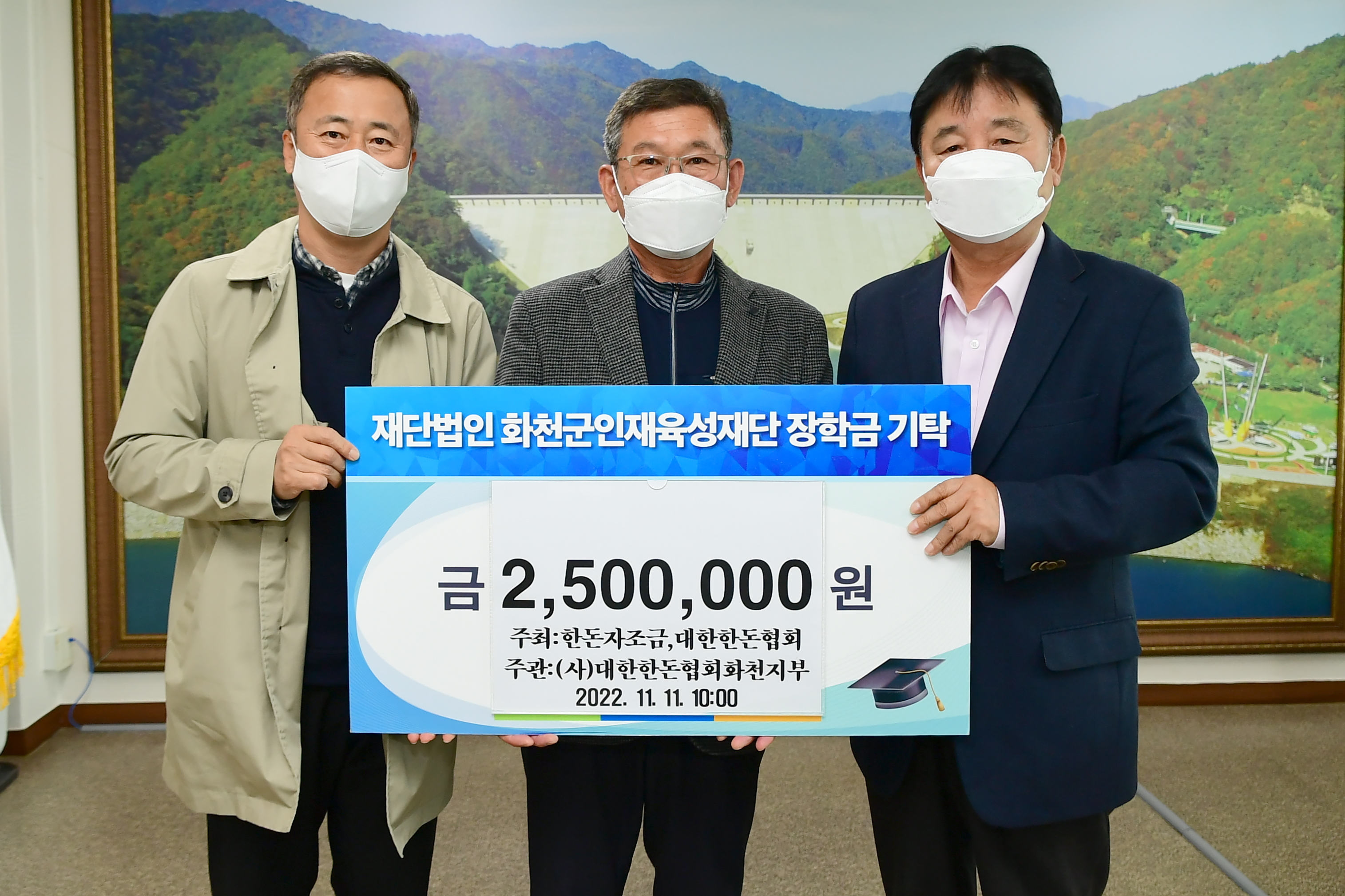 [강원사회복지신문 이정환 기자]=최기해 (사)대한한돈협회 화천지부장(사진 가운데), 홍순규 사무국장은 지난 11월 11일 최문순 화천군 인재육성재단 이사장을 방문해 한돈자조금과 대한한돈협회 장학금 250만원을 기탁했다.