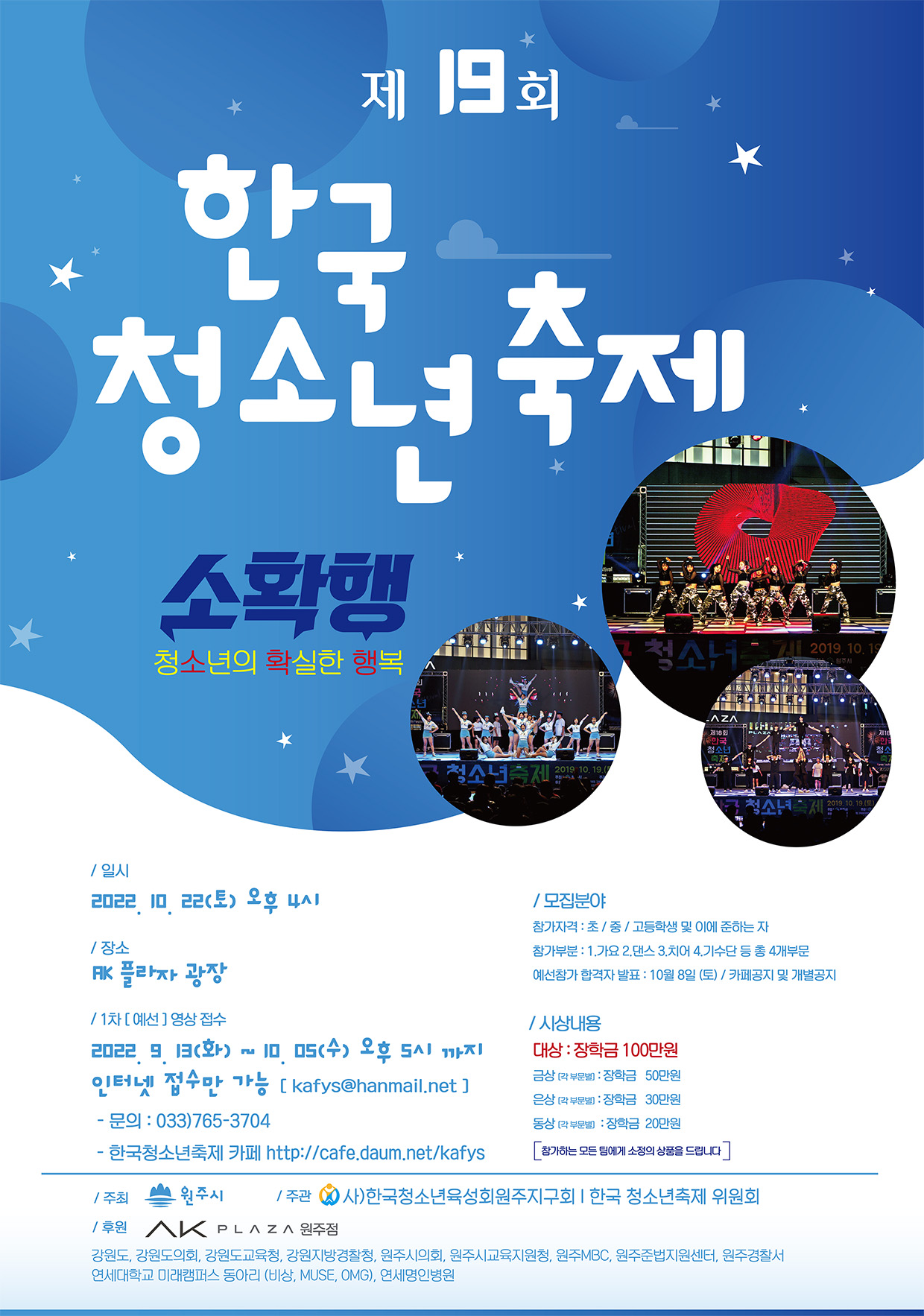 [강원사회복지신문 홍기한 기자]=한국청소년육성회 원주지구회가 주관하는 '제19회 한국청소년 축제'가 지난 10월 22일 오후 4시 원주 AK백화점 앞 광장에서 개최되었다. 이번 축제에서는 밴드동아리, 합기도 등 다양한 축하공연을 시작으로 가요 3팀, 기수 3팀, 댄스 5팀, 치어 4팀 등 총 15팀의 다채로운 경연이 펼쳐졌다....