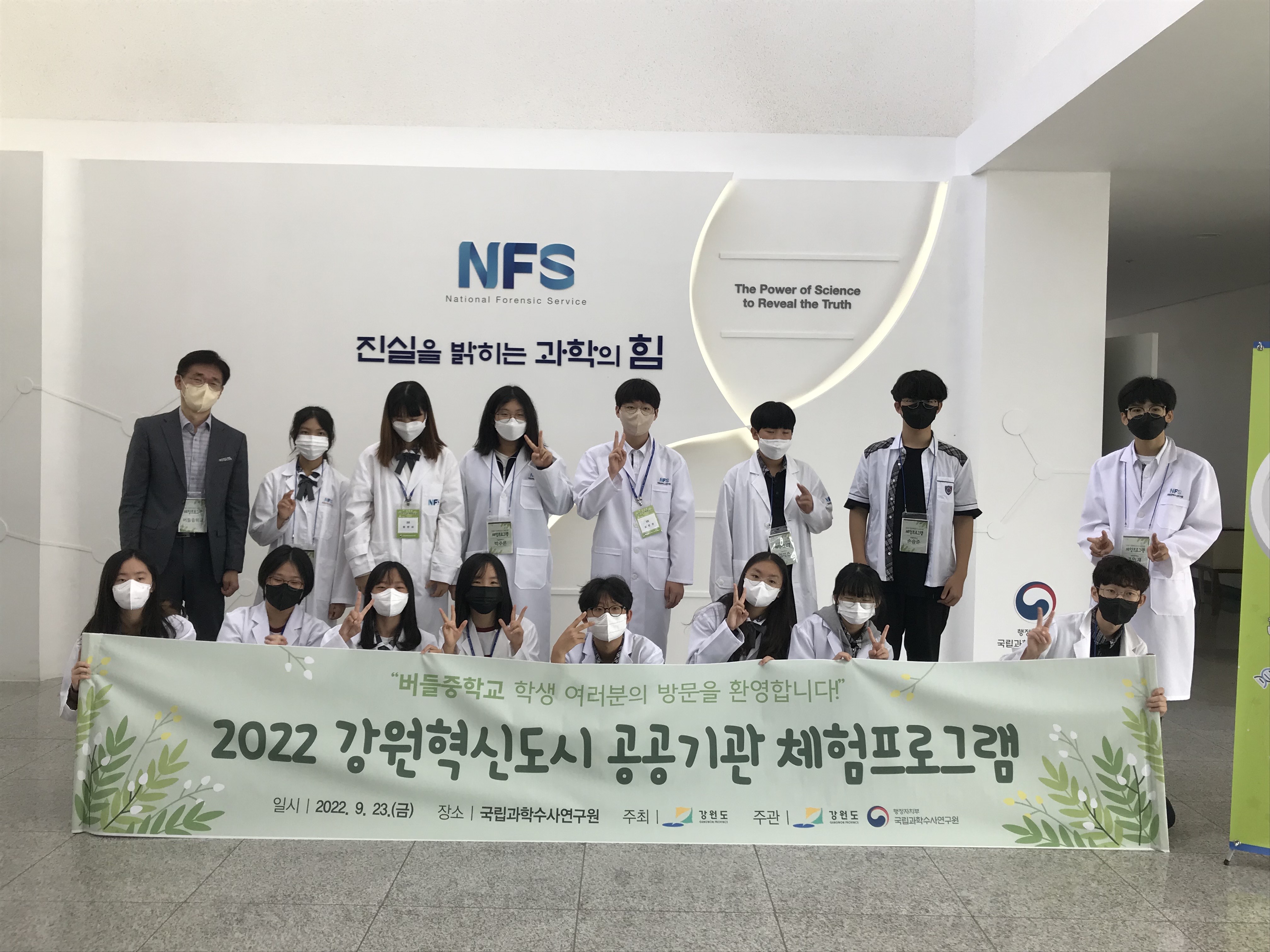[강원사회복지신문 김도연 기자]=원주 버들중학교(교장 최용수)는 지난 9월 23일(금) 오전 버들중학교 1학년 학생 15명을 대상으로 원주 혁신도시에 위치한 국립과학수사연구원으로 체험학습을 실시하였다. 이번 체험학습은 2022년 강원혁신도시 공공기관 체험 프로그램의 하나로 실시하여 혁신도시에 위치한 버들중학교 학생...