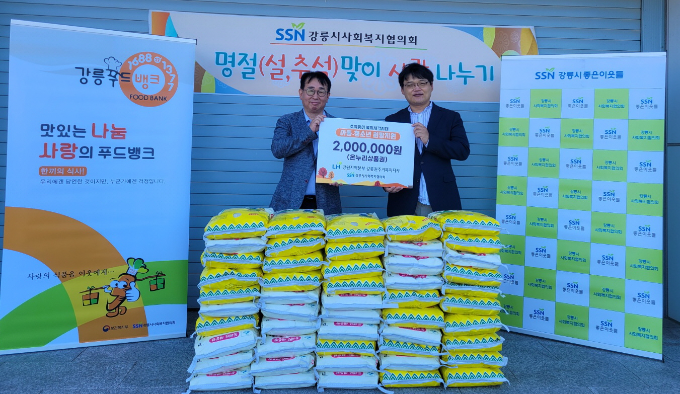 [강원사회복지신문 서은진 기자]=[강원사회복지신문 서은진 기자]=복지사각지대 아동·청소년 50가구 쌀(10kg) 지원 LH 강원지역본부 강릉권주거복지지사는 최근 강릉시사회복지협의회에 온누리상품권 200만원을 후원하여 소외계층 아동·청소년 50가구에 쌀10kg씩을 지원하였다.