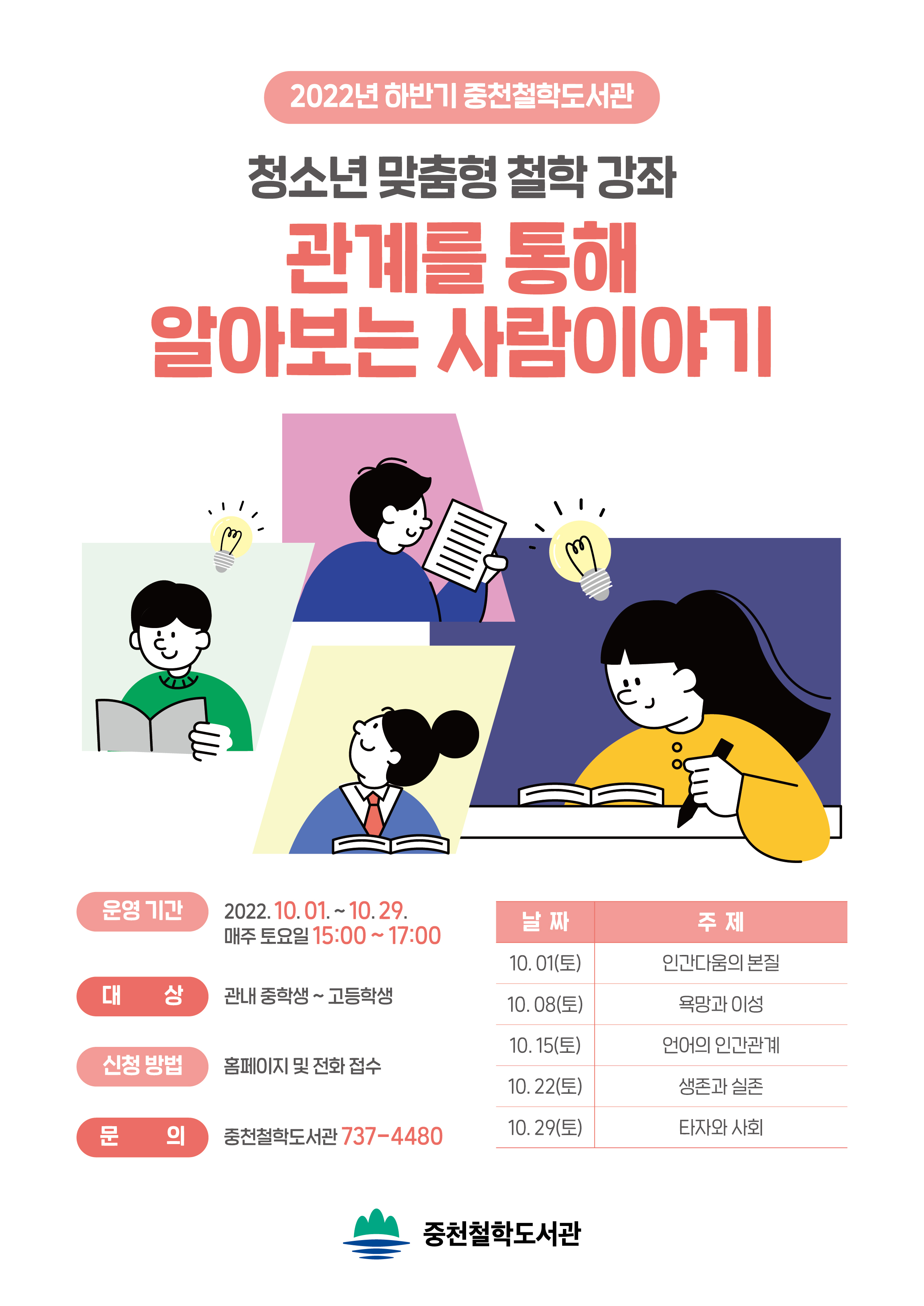 [강원사회복지신문 홍기한 기자]=지난 9월 21일 오전 10시부터 중천철학도서관 홈페이지 선착순 20명 모집 중천철학도서관은 2022년 하반기 두 번째 청소년 맞춤형 철학 강좌 '관계를 통해 알아보는 사람 이야기'를 운영한다. 청소년들의 비판적 능력 및 문제 상황을 자유롭게 탐구해 올바른 앎을 갖춘 개인으로 성장할 수 있...
