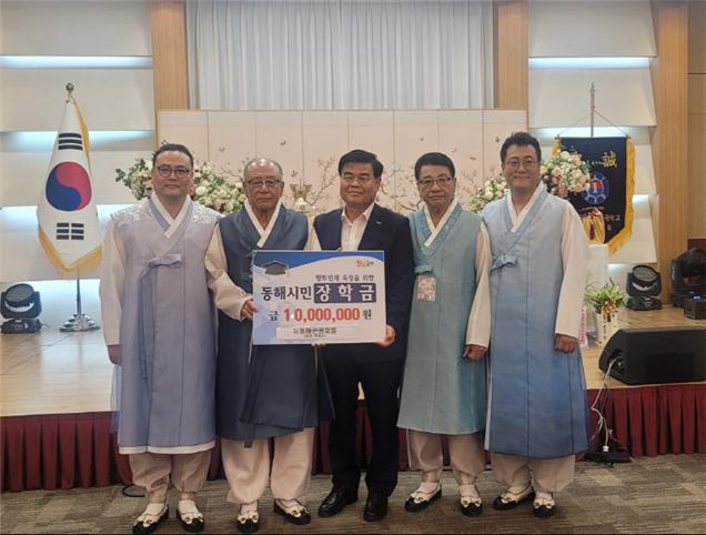 뉴동해관광호텔(회장 박재두)은 지난 7월 20일 개관 35주년 및 박재두 회장의 산수연을 기념하여 지역의 우수한 인재들을 지원하는 데 힘쓰고자 동해시민 장학금 일천만원을 전달했다.