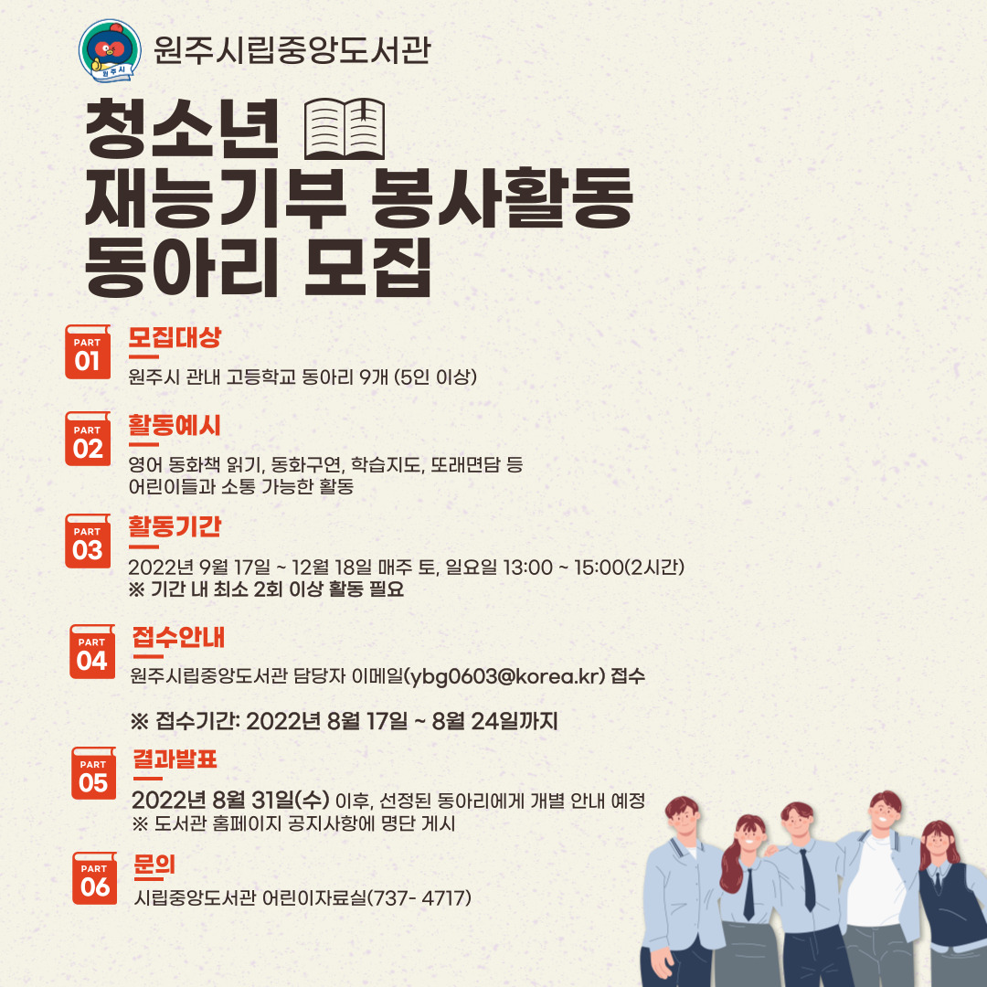 [강원사회복지신문 서은진 기자]=8월 17일부터 담당자 이메일 접수, 31일 결과 발표 9월 17일부터 12월 18일까지 시립중앙도서관 1층 어린이자료실에서 매주 토·일 진행 원주시립중앙도서관(관장 이문희)은 2022년 청소년 재능기부 봉사활동에 참여할 관내 고등학교 동아리 학생들을 모집한다. 청소년 재능기부 봉사활동은 ...