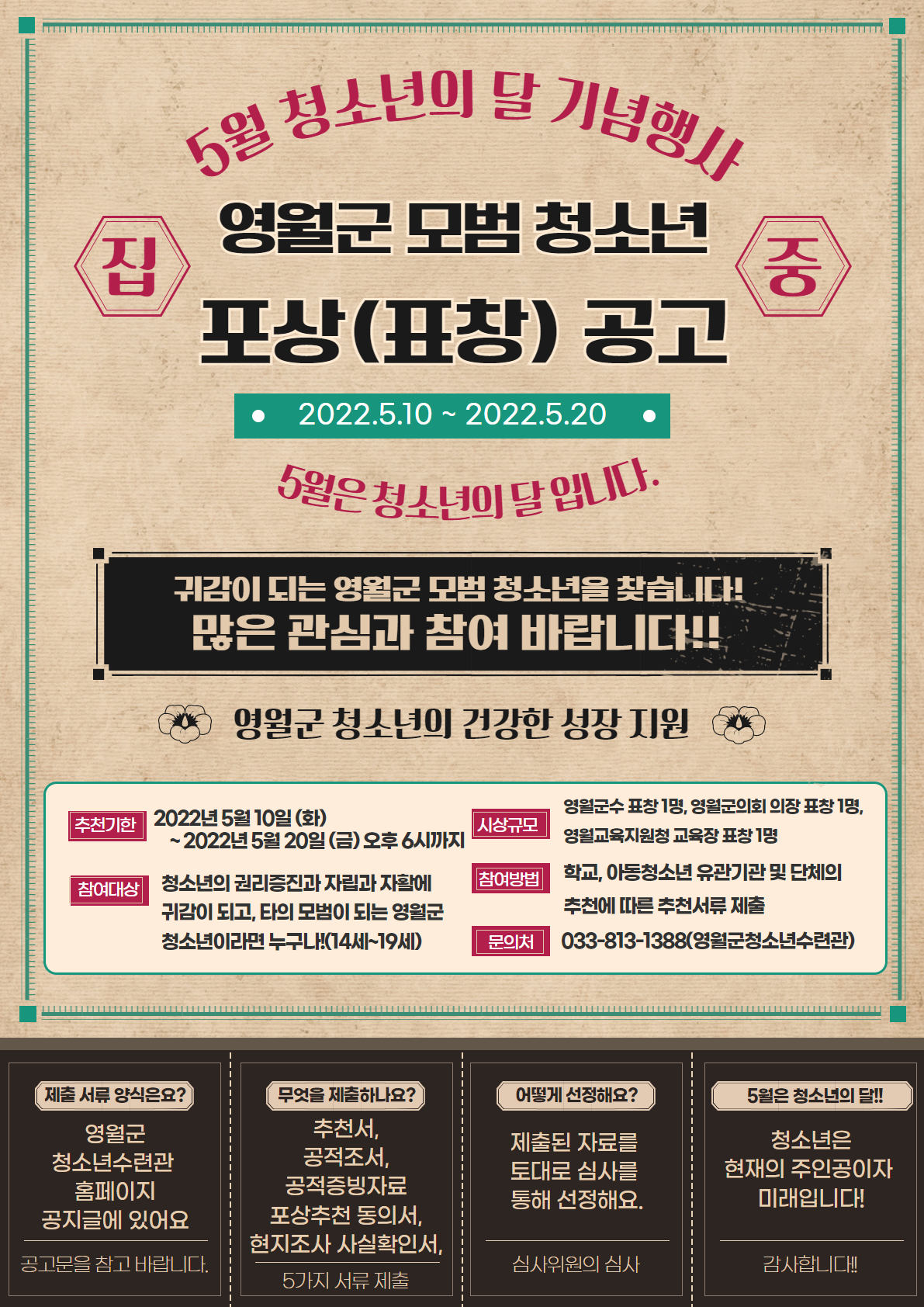 [강원사회복지신문 이정환 기자]=영월군청소년수련관은 5월, 청소년의 달을 맞아 오는 5월 28일 2022년 영월군 청소년의 달 기념행사 'Feel이 通하는 한마당'을 영월군청소년수련관 앞마당 에서 개최한다. 영월군 청소년의 달 기념행사(Feel이 通하는 한마당)은 사회적 거리두기 해제 후 첫 대면 행사이며 개회식을 시작으로...