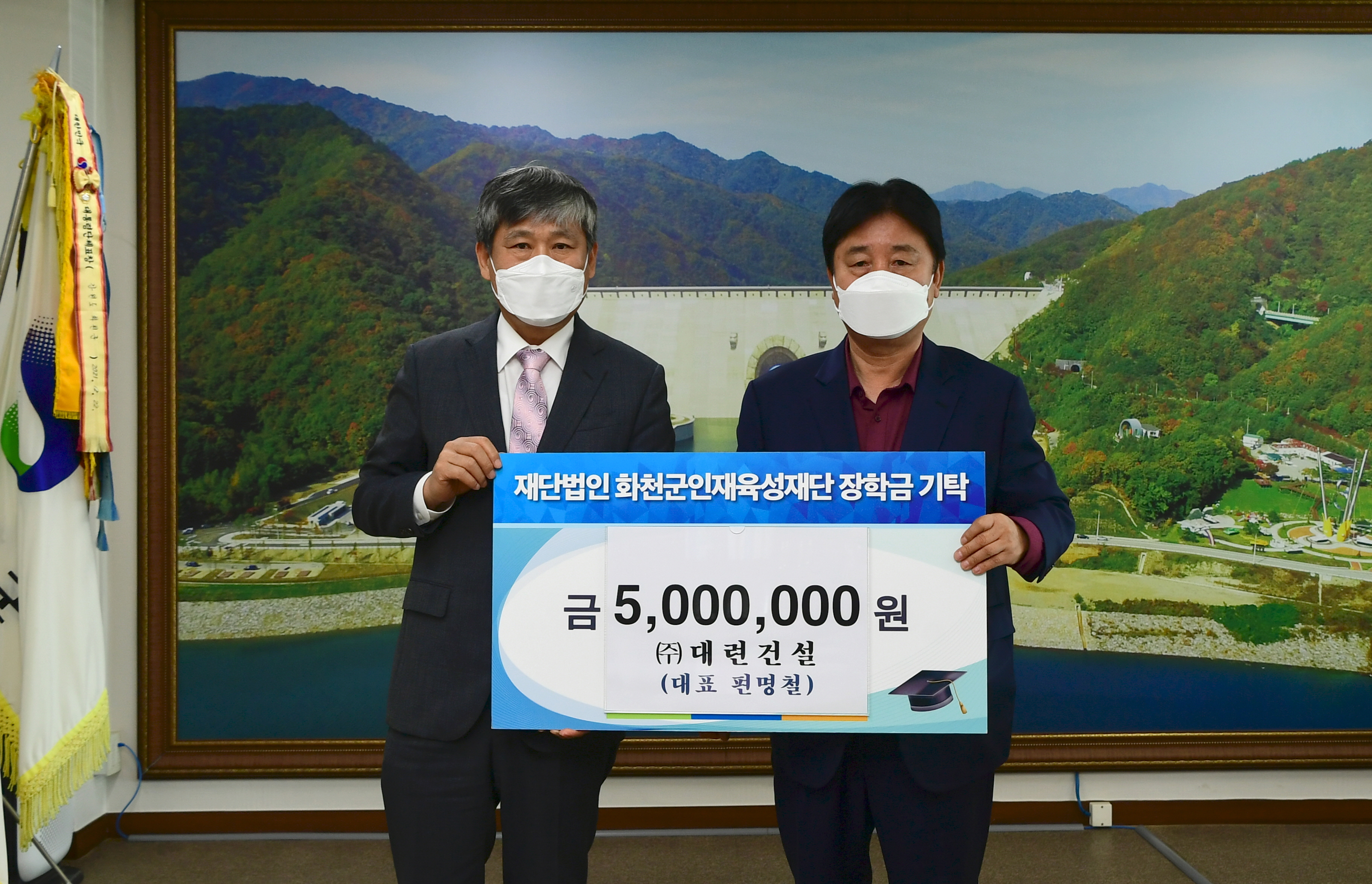 [강원사회복지신문 이정환 기자]=편명철 (주)대련건설 대표는 지난 4월 7일 최문순 화천군 인재육성재단 이사장을 방문해 장학금 500만원을 기탁했다.