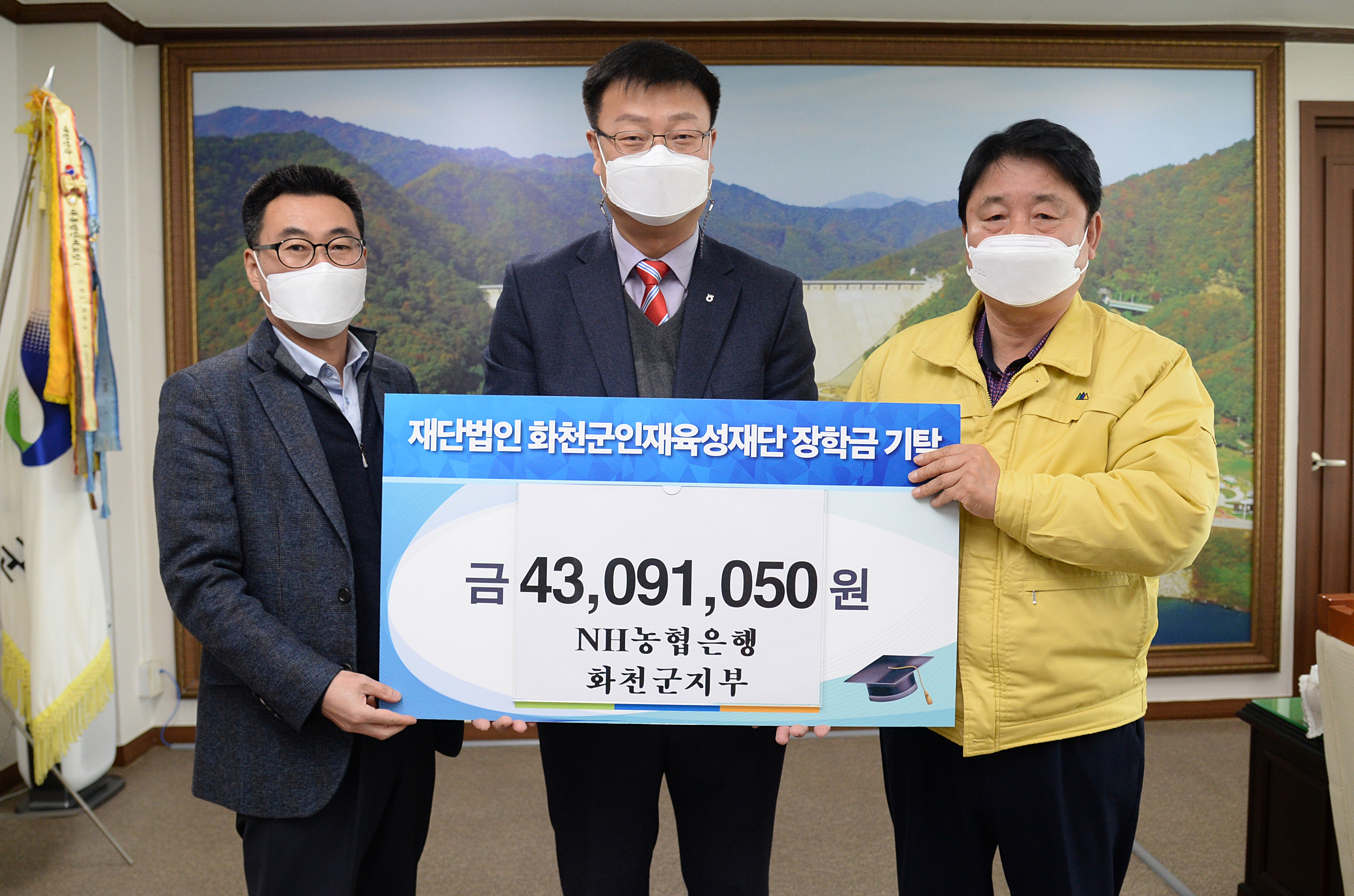 [강원사회복지신문 이정환 기자]=NH농협 화천군지부(지부장:봉윤일)는 지난 2월 25일 최문순 화천군 인재육성재단 이사장을 방문해 장학금 4,309만1,050원을 기탁했다.