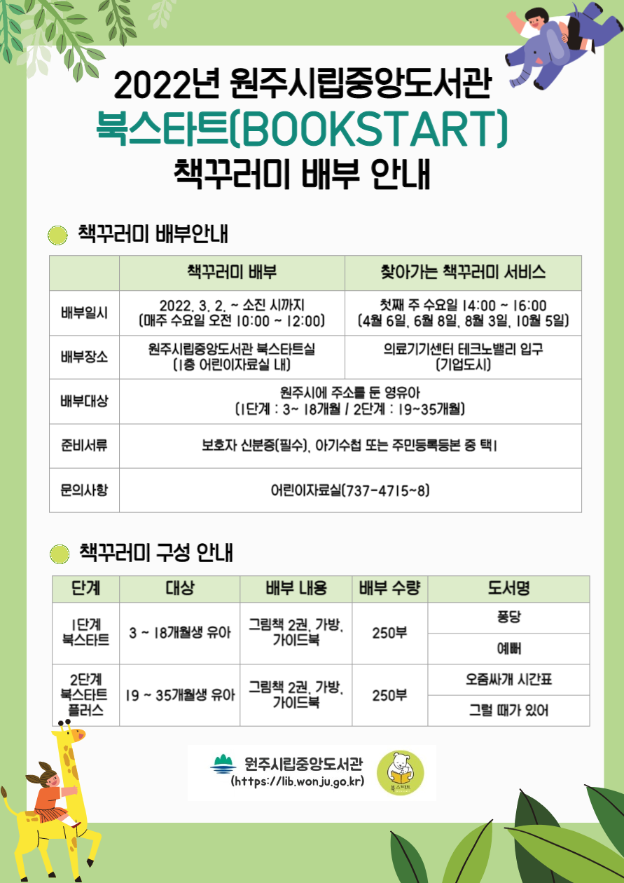 [강원사회복지신문 서은진 기자]=3~35개월생 영유아 대상 그림책과 북스타트 가이드북 배부 3월 2일부터 매주 수요일 중앙도서관, 중천철학도서관에서 선착순 배부 원주시립중앙도서관은 오는 3월 2일부터 중앙도서관과 중천철학도서관에서 북스타트 책꾸러미를 배부한다고 밝혔다. 북스타트란 '책과 함께 인생을 시작하자'라...