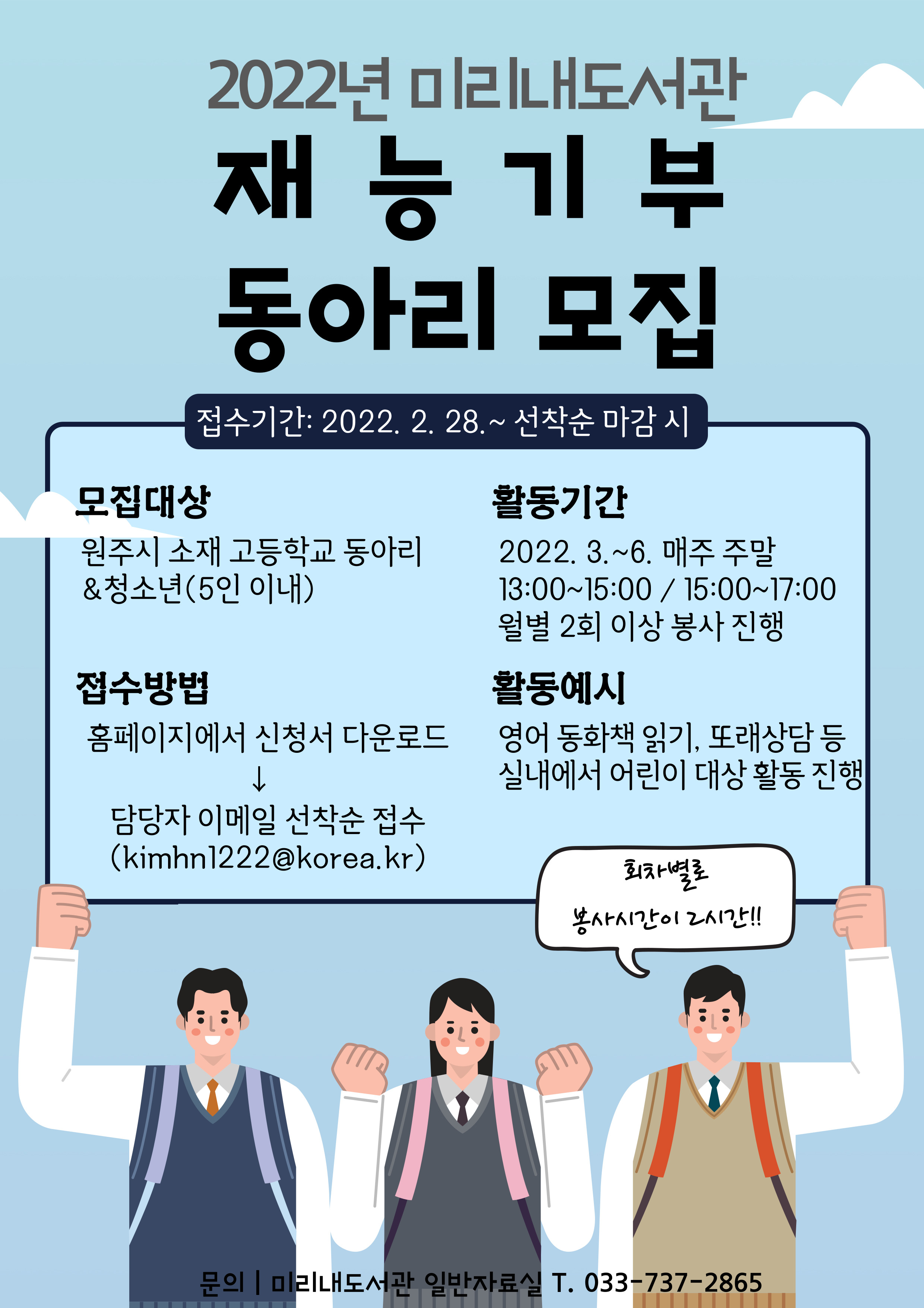 [강원사회복지신문 서은진 기자]=원주시 내 고등학교 동아리를 비롯한 청소년 5인 이상 대상 모집 어린이에게 책 읽어주기, 또래 상담 등 다양한 봉사활동 원주시 미리내도서관(관장 김영열)은 2022년 상반기 재능기부 봉사활동에 참여할 관내 고등학교 동아리 학생을 모집한다. 모집 대상은 관내 고등학교 동아리를 비롯한 ...