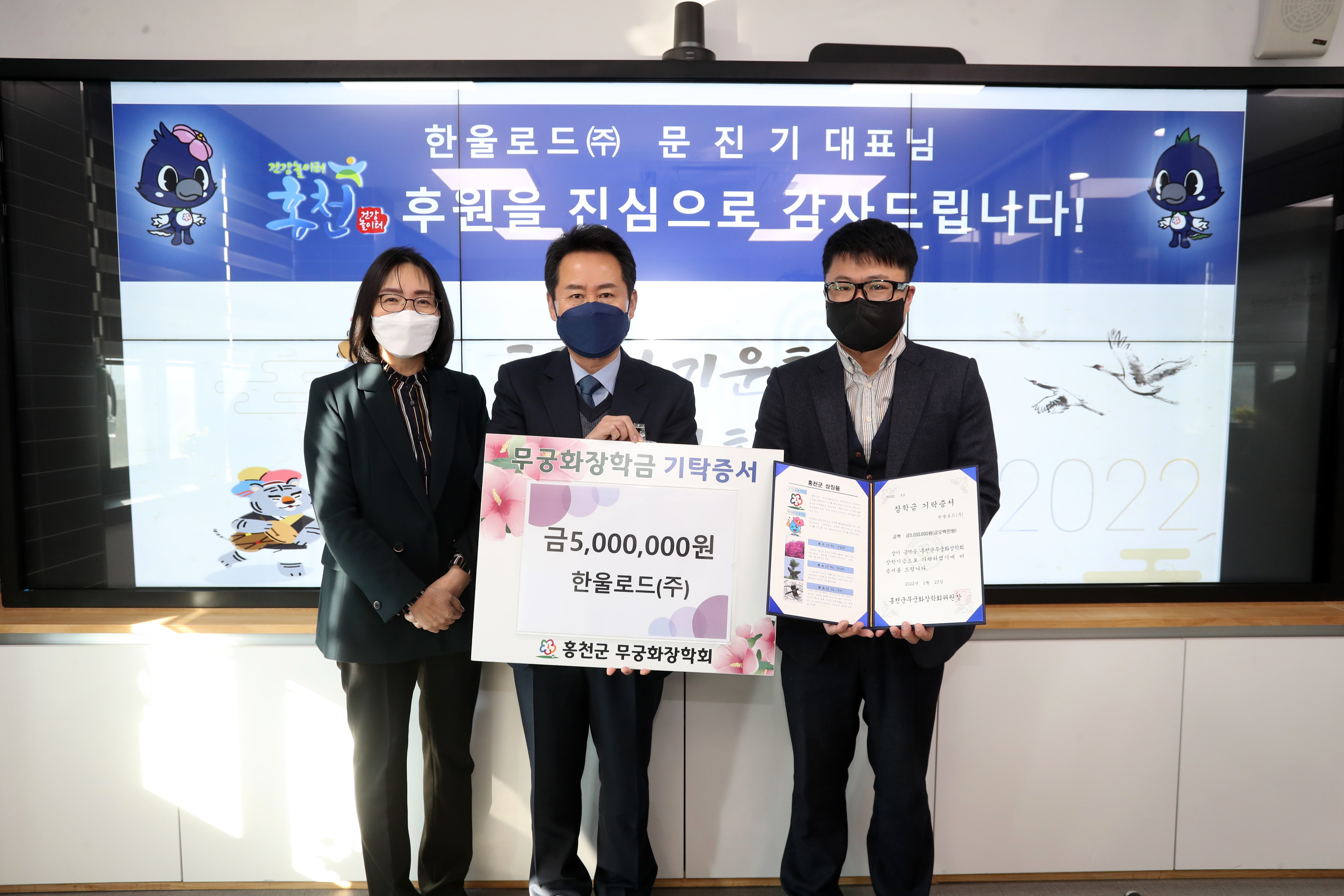 [강원사회복지신문 홍기한 기자]=한울로드(주)(대표 문진기)는 지난 2월 23일 홍천군청을 방문, 홍천군 인재 육성을 위한 무궁화장학금 500만원을 기탁했다.