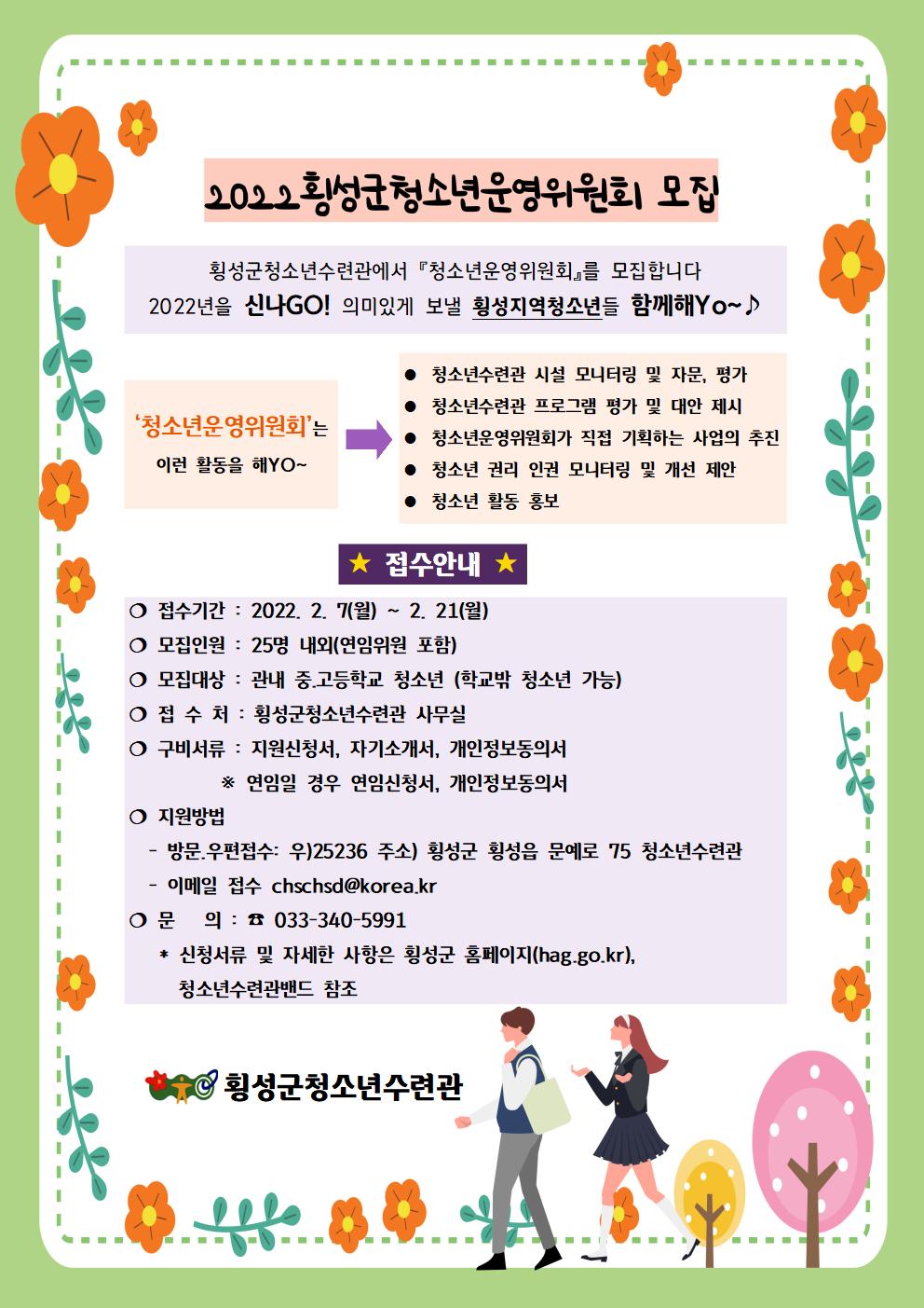 [강원사회복지신문 홍기한 기자]=횡성군청소년수련관은 오는 2월 21일까지 횡성군 청소년운영위원회에 참가할 지역 청소년을 모집한다고 밝혔다. 횡성군 청소년운영위원회는 청소년수련관 운영의 효율성을 높이기 위해, 청소년이 주체적으로 수련관 운영 및 프로그램에 대해 모니터링하고 다양한 의견 및 요구를 제안하기 위...