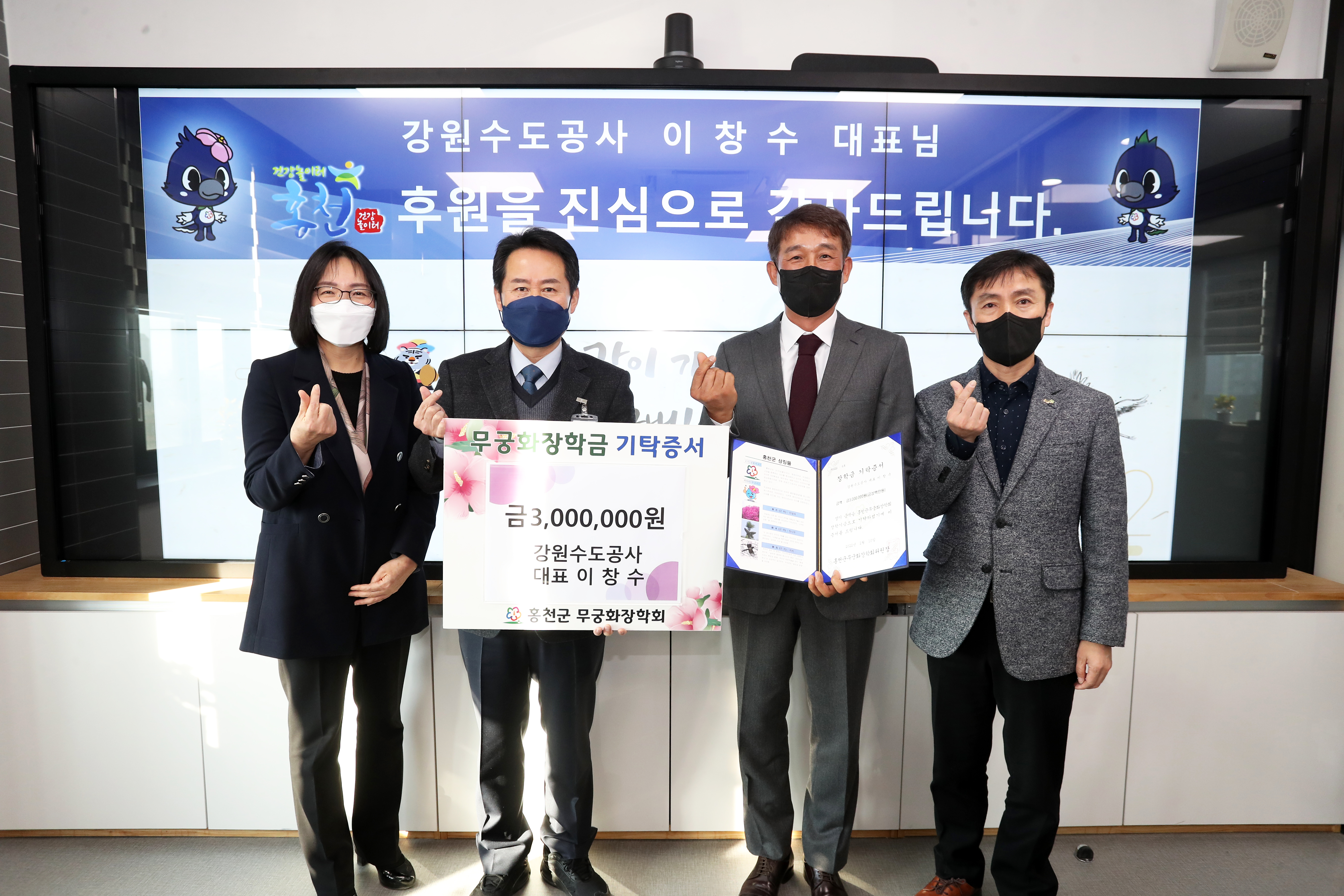 [강원사회복지신문 홍기한 기자]=이창수 강원수도공사 대표는 지난 2월 10일 홍천군청을 방문, 홍천군 인재 육성을 위한 무궁화장학금 300만원을 기탁했다. 홍기한 기자