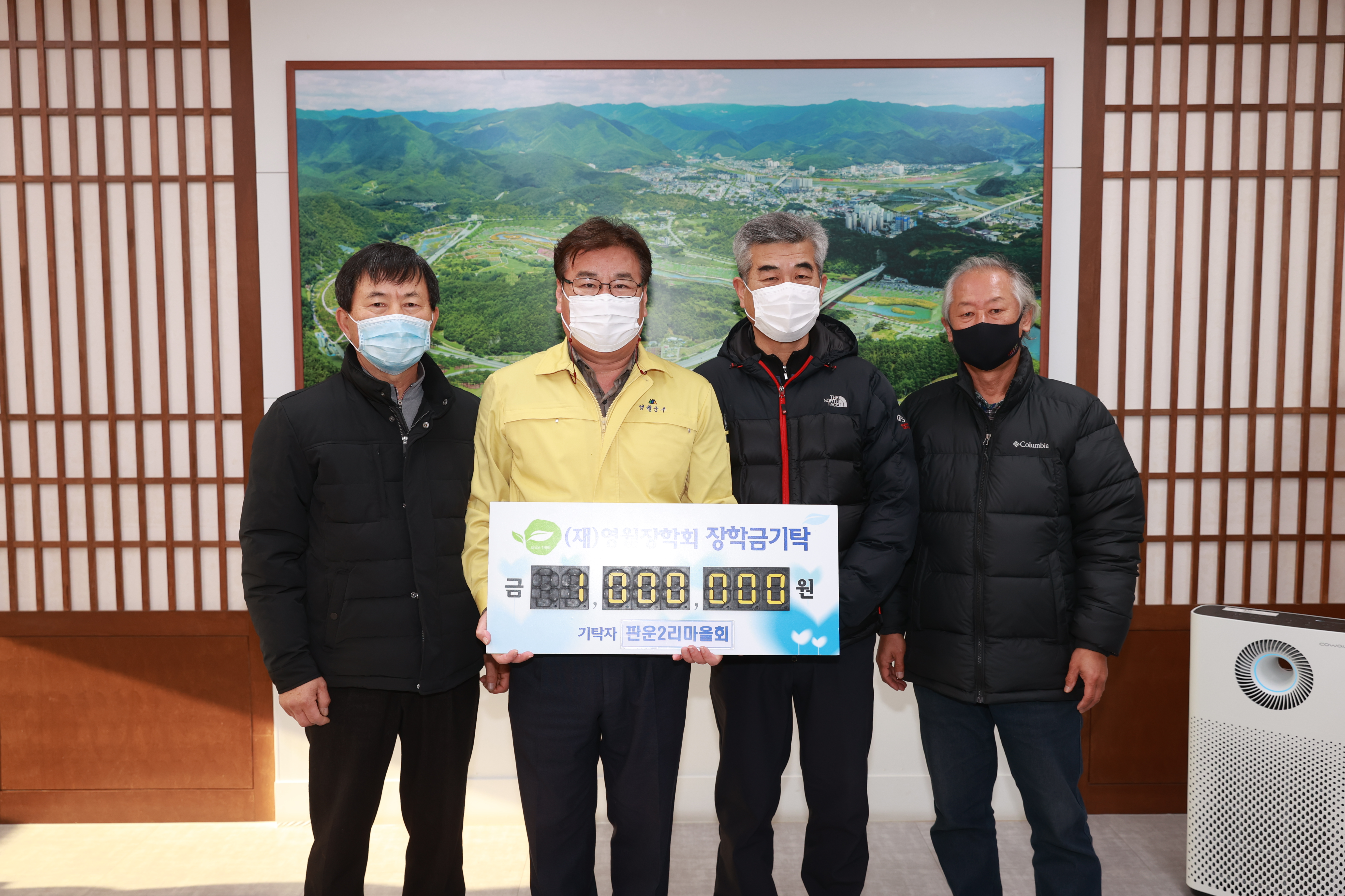 [강원사회복지신문 홍기한 기자]=영월군 판운2리마을회(이장 김장선)는 지난 1월 11일 영월지역 인재육성을 위해 장학금으로 쓰이길 바란다며 1백만원을 재단법인 영월장학회(이사장 최명서)에 기탁하였다.