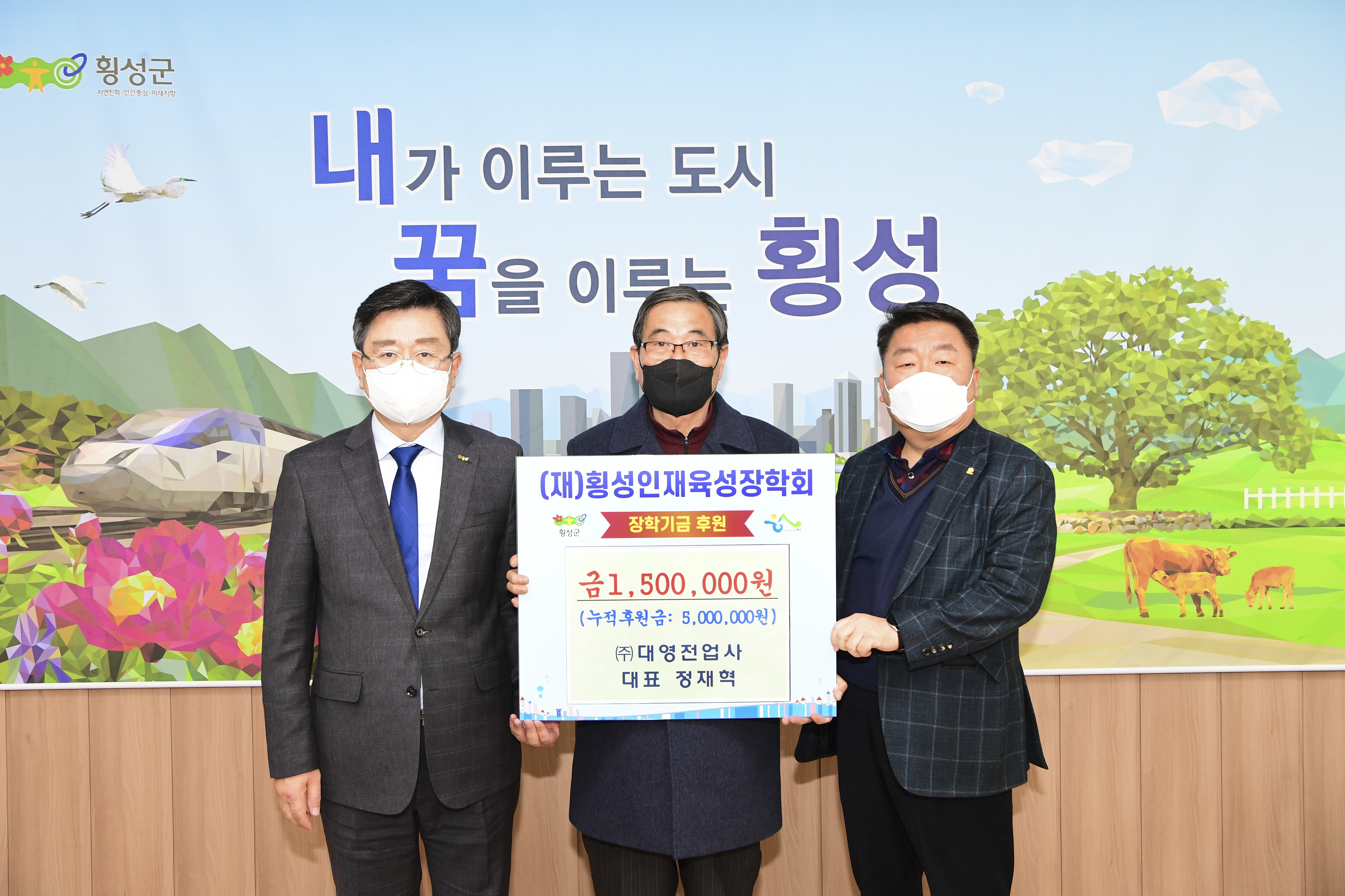 [강원사회복지신문 서은진 기자]=(주)대영전업사(대표 정재혁)는 지난 1월 10일 오후 1시 30분, 횡성군수 집무실을 방문해 횡성인재육성장학금 150만원을 기탁하였다. 이날 장학금 기탁으로 (주)대영전업사의 장학금 누적 금액은 500만원이 되었다. 이날 기탁식에는 정재혁 대표와 횡성인재육성장학재단 조원용 상임이사와 최...