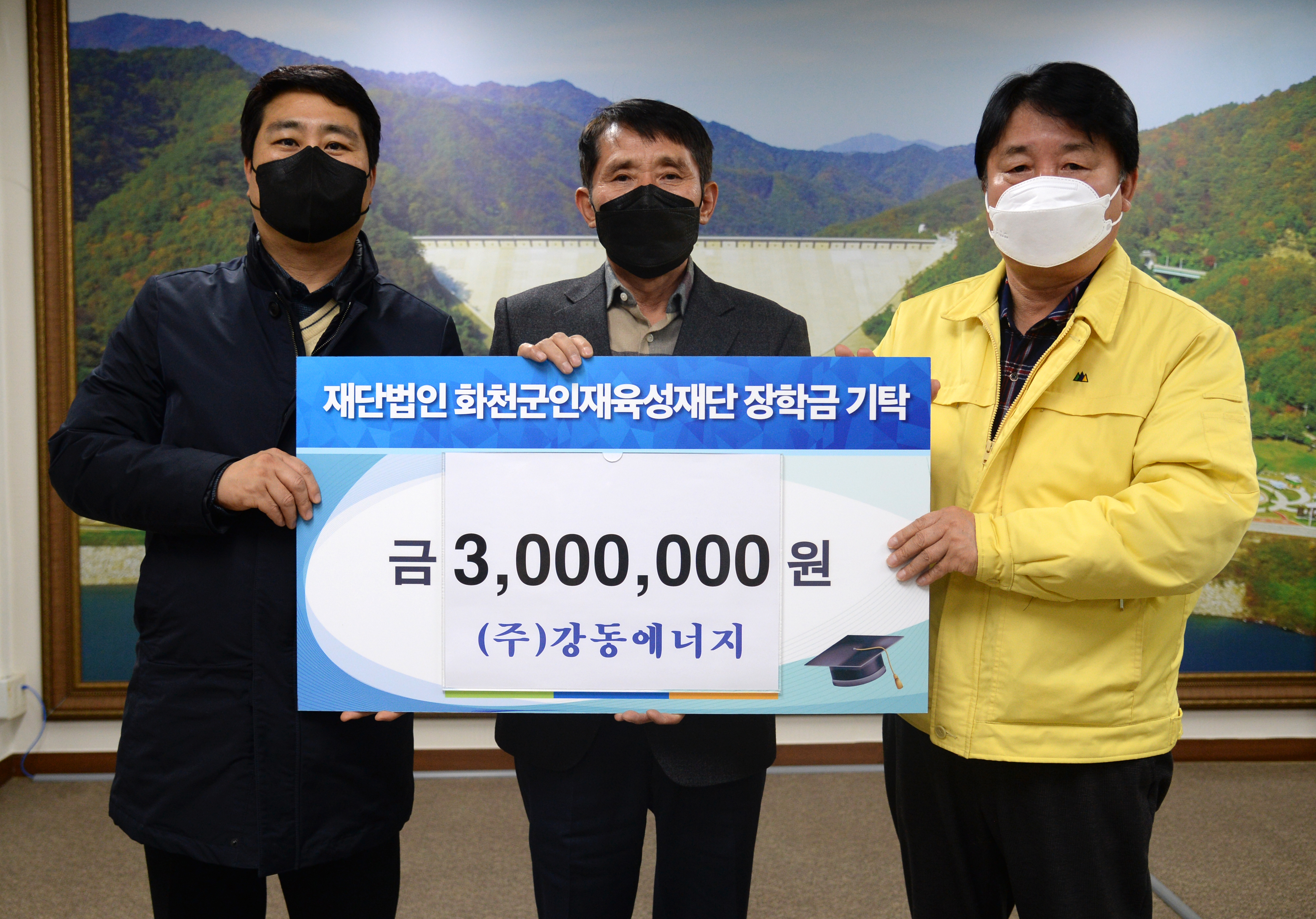 [강원사회복지신문 이정환 기자]=(주)강동에너지(대표:황인준)는 지난해 12월 24일 최문순 화천군 인재육성재단 이사장을 방문해 장학금 300만원을 기탁했다.