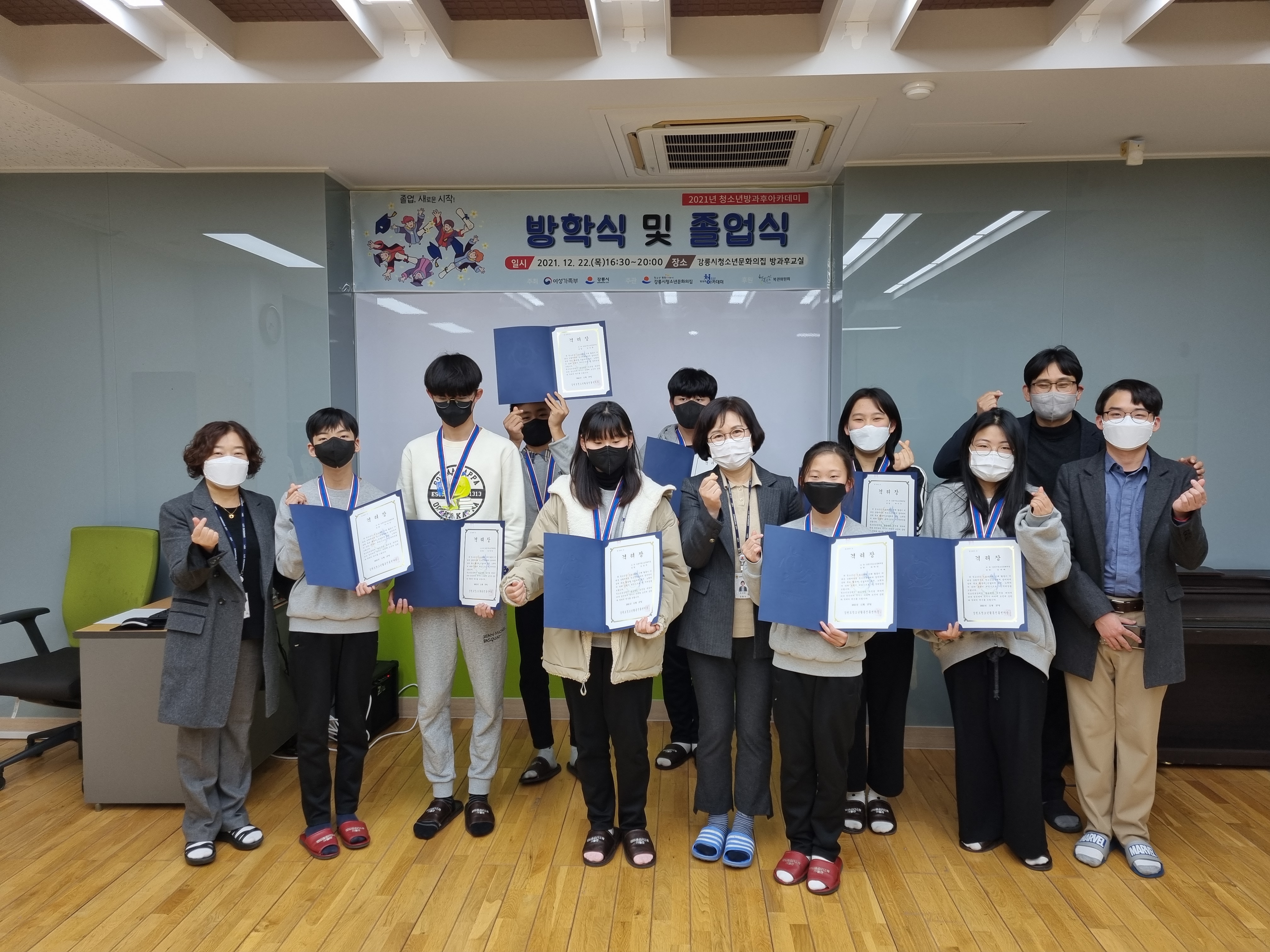 [강원사회복지신문 김종한 기자]=졸업장 수여 및 우수청소년 시상, 프로그램등 다채로운 행사 진행 강릉시청소년문화의집 청소년방과후아카데미는 지난 12월 22일(수) 한 해 동안 열심히 활동한 청소년들을 격려하는 '2021년 청소년방과후아카데미 졸업식 및 방학식'을 진행하였다. 졸업식 및 방학식은 강릉시청소년문화의집...