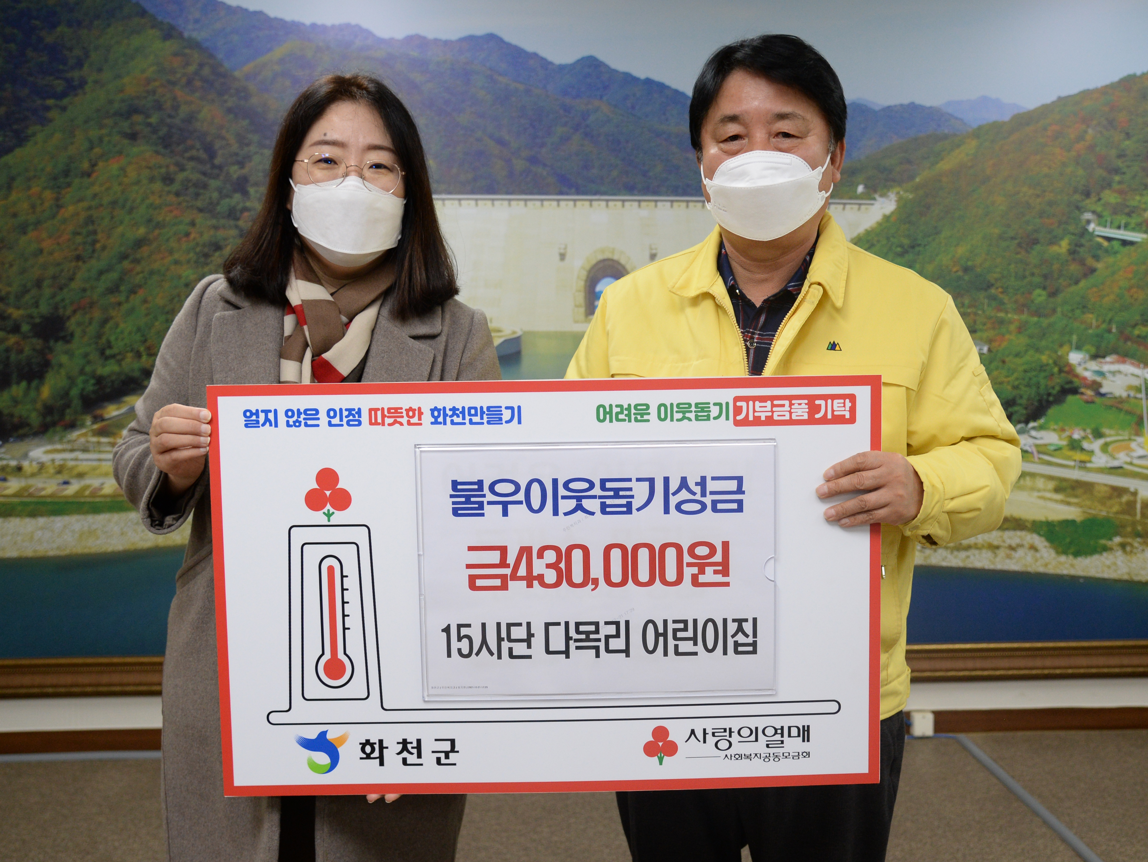 [강원사회복지신문 이정환 기자]=15사단 다목리 어린이집(원장:유준숙)은 지난 12월 24일 최문순 화천군수를 방문해 이웃돕기 성금 43만원을 기탁했다.