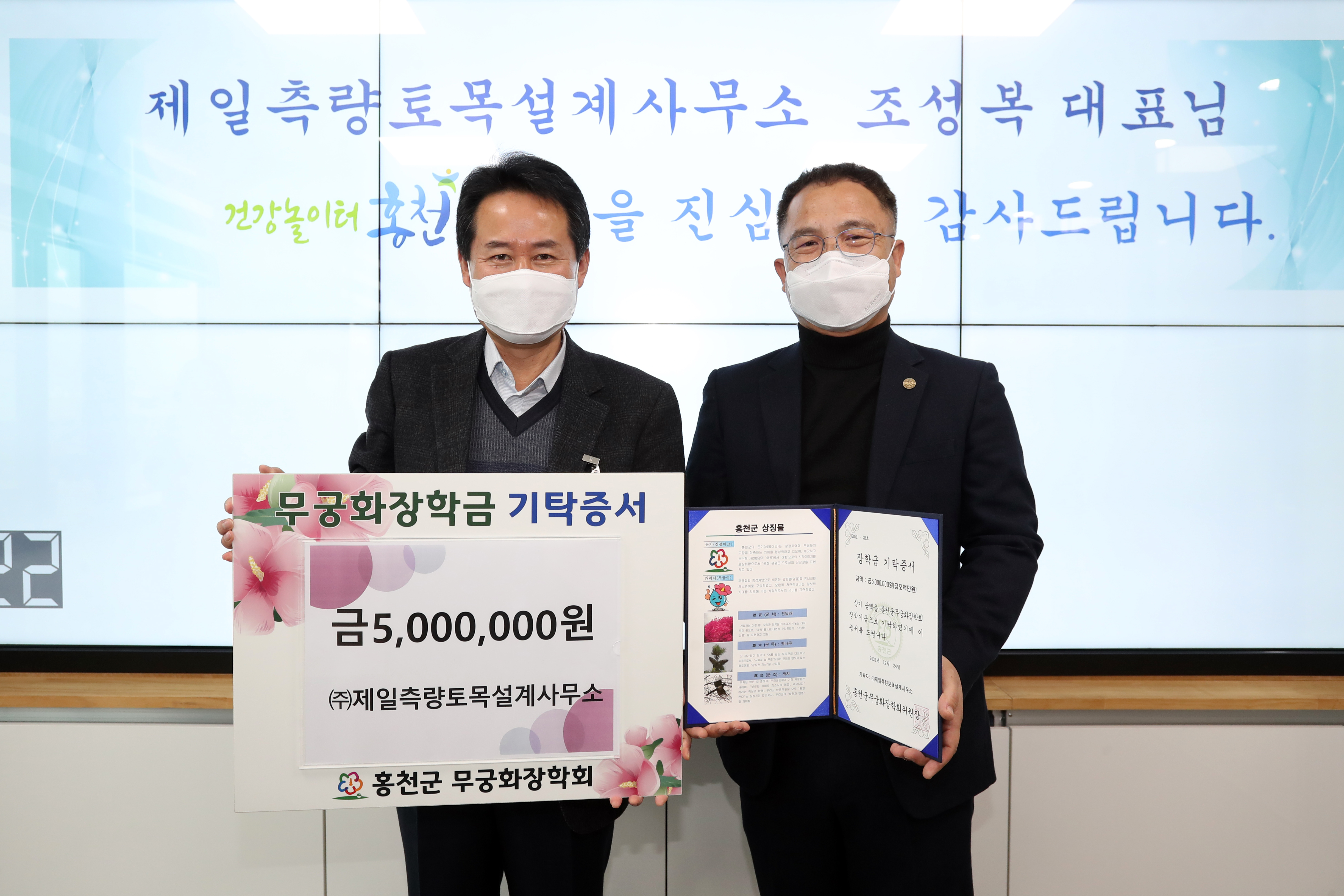 [강원사회복지신문 서은진 기자]=조성복 (주)제일측량토목설계사무소 대표는 지난 12월 24일 홍천군청을 방문, 허필홍 홍천군수에게 홍천군 인재육성을 위한 무궁화장학금 500만원을 기탁했다.